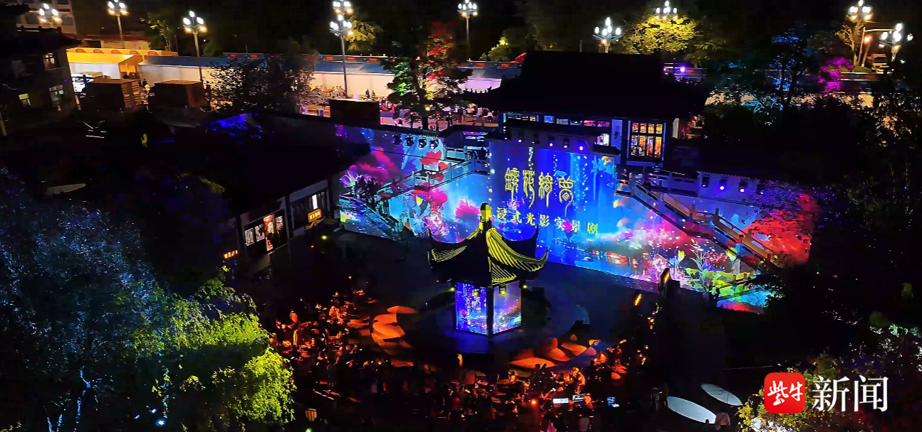 更具巧思的是,项目打造了“白+黑”全时体验闭环。白天可品茗听评书、打卡主题装置,夜间除主线演出外,还有《镜花密盒》互动答题赢文创、瑶池仙子独舞、多国文创市集等特色环节。正如观众所言:“灯光亮起时,老院子像换了天地,演员在身边穿梭,真有种走进书里的错觉。” 作为热门综艺《假期中的她们》姐姐们的打卡地,这种“光影科技+实景叙事+深度互动”的模式,让传统文化真正“活”了起来,更成为海州夜间经济的新标杆。