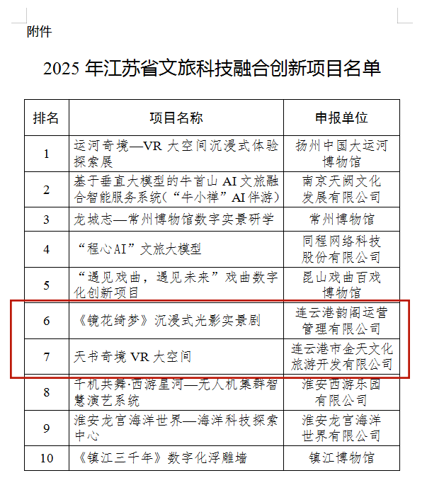 近日,江苏省文旅科技融合创新项目名单正式公布,海州两大文旅标杆项目——双龙井《镜花绮梦》沉浸式光影实景剧与桃花涧“天书奇境”VR大空间双双成功入选,且为全市仅有的两个入选项目,用“文旅+科技”的创新实践,彰显了海州文旅产业的硬核实力。
