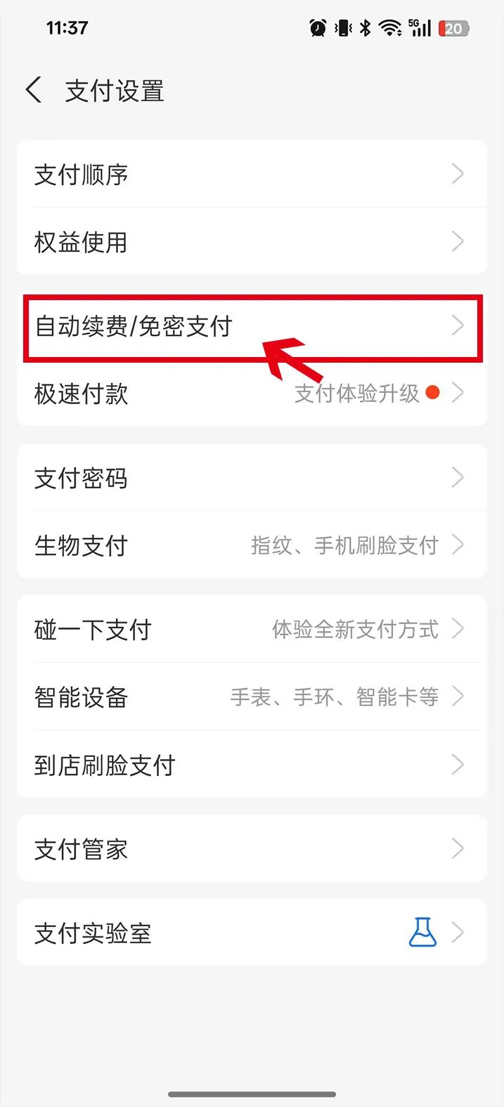 点击“我的”→右上角“设置”→“支付设置”→“自动续费/免密支付”→“免密支付”→“付款码免密支付”,进入后可关闭。