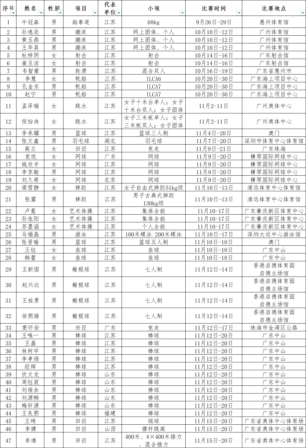 蹦床比赛于10月10日在广州体育馆开赛。3名扬州运动员孙逸辰、黄玉鼎、王华昊出现在了江苏队的参赛名单中。