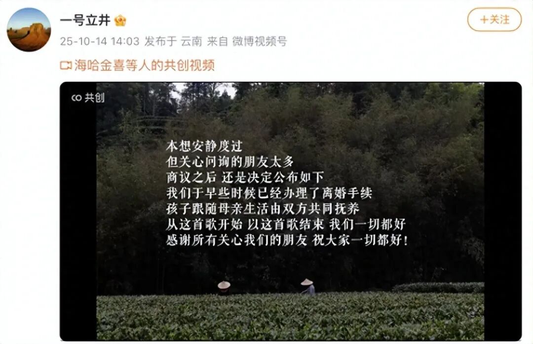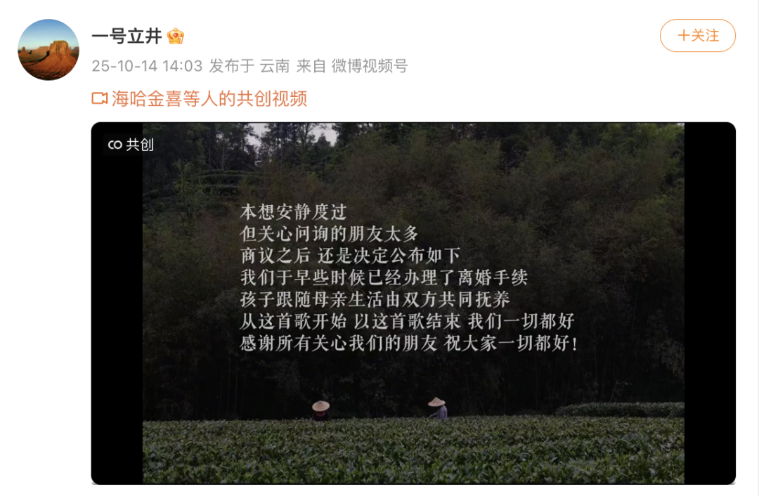 10月14日,李亚鹏@一号立井 与妻子@海哈金喜 在微博发布视频宣布离婚:“我们于早些时候已经办理了离婚手续,孩子跟随母亲生活由双方共同抚养。”
