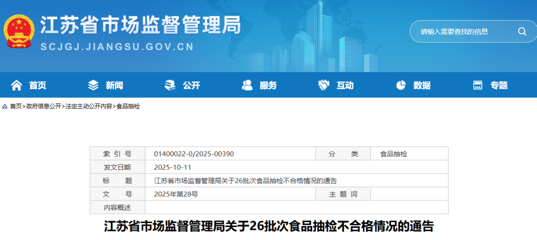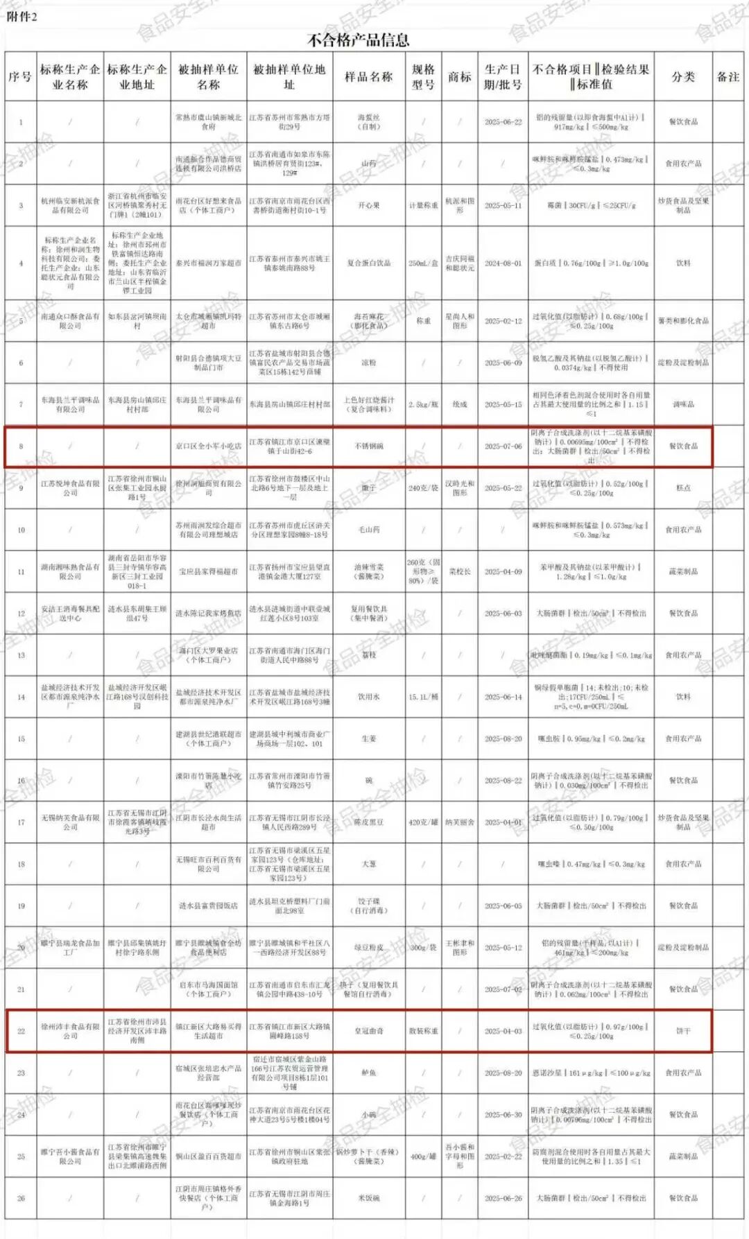 近期,江苏省市场监督管理局组织食品安全抽检,抽取食用农产品、调味品、糕点、酒类、粮食加工品、炒货食品及坚果制品、饮料、餐饮食品、豆制品、饼干、蔬菜制品、薯类和膨化食品、蜂产品、速冻食品、食用油、油脂及其制品、特殊医学用途配方食品、肉制品及食品添加剂等18大类食品1323批次样品,检出其中餐饮食品、食用农产品、炒货食品及坚果制品、淀粉及淀粉制品、饼干、调味品、薯类和膨化食品、糕点、蔬菜制品及饮料等10大类食品26批次样品不合格,详细信息见附表。