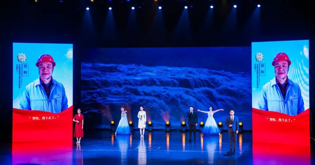 音诗舞画《礼赞》以启东烈士徐辉为原型,讲述那段震撼人心的生命壮举。徐辉生前系通州建总集团有限公司员工,2009年随公司第一批进驻青海,从此驻扎大西北。2023年7月19日,徐辉与同事在河边散步时,发现一名女子落水,他不顾个人安危跃入激流,在翻滚的漩涡里,奋力抓住了落水女子。但由于水流湍急,加上体力消耗,徐辉不幸牺牲。当徐辉遗体被打捞上岸时,他的双臂仍保持着向上托举的姿势,令在场所有人动容。聚光灯下,朗诵者的声音从平缓到激昂,情绪层层递进、愈发浓烈。当“英雄远去,浩气长存,那是每一位江海儿女心里激荡起的热烈回响”的朗诵收尾,全场掌声雷动,久久未歇,那是对英雄的追思,也是对“见义勇为”精神最热烈的礼赞。