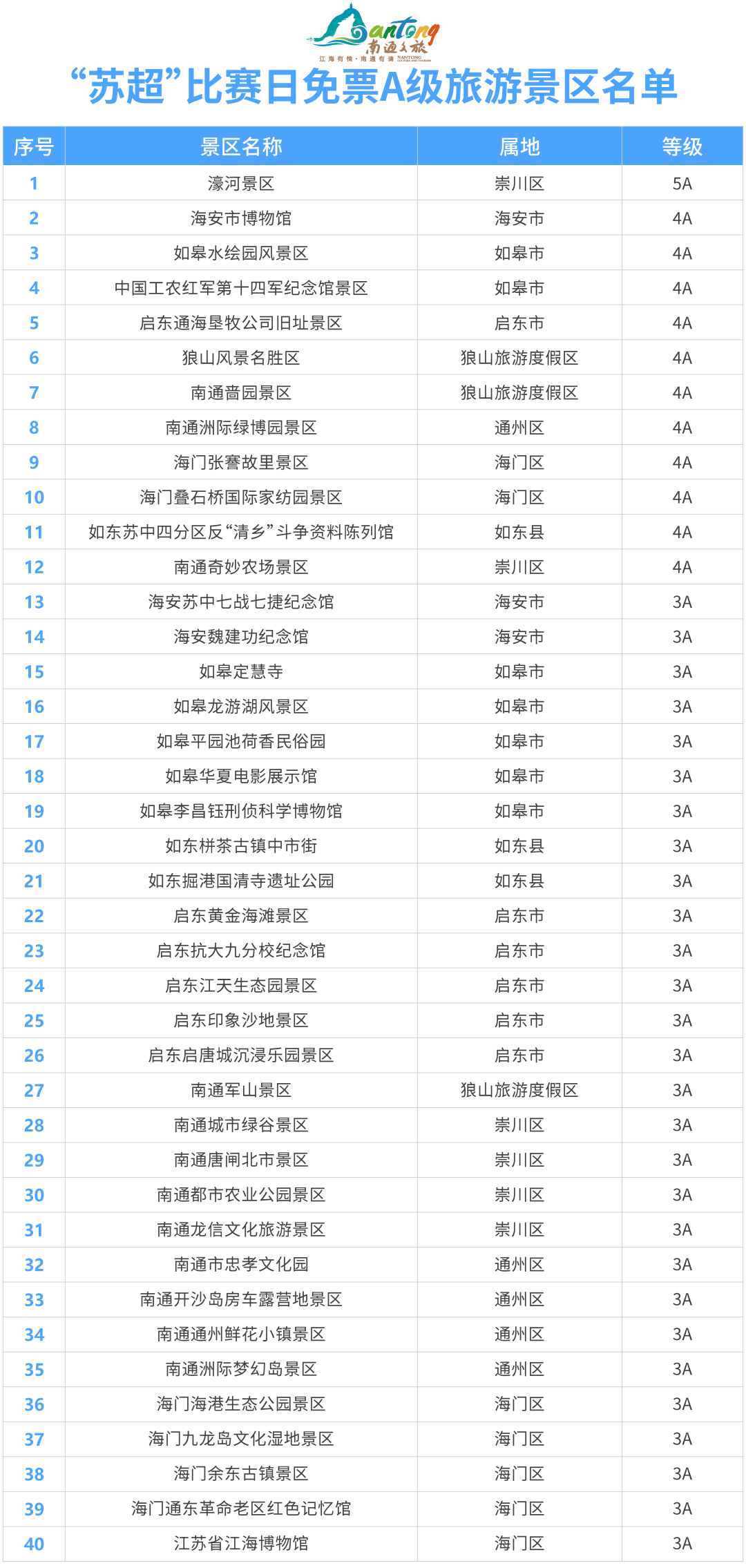 10月17日-21日,持有江苏省城市足球联赛半决赛各场次比赛票根的观众,以及全体无锡市民,在南通狼山、啬园、洲际梦幻岛、启唐城、奇妙农场等40家A级旅游景区,可享受免景区门票入园一次优惠,领略南通滨江霞照、文峰塔影、狼山抒怀、日出江海等独特风情。