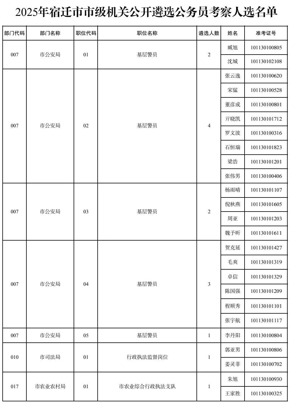 2025年宿迁市市级机关公开遴选公务员面试工作已经结束,根据《2025年宿迁市市级机关公开遴选公务员公告》有关规定,现将考察人选名单予以公布。