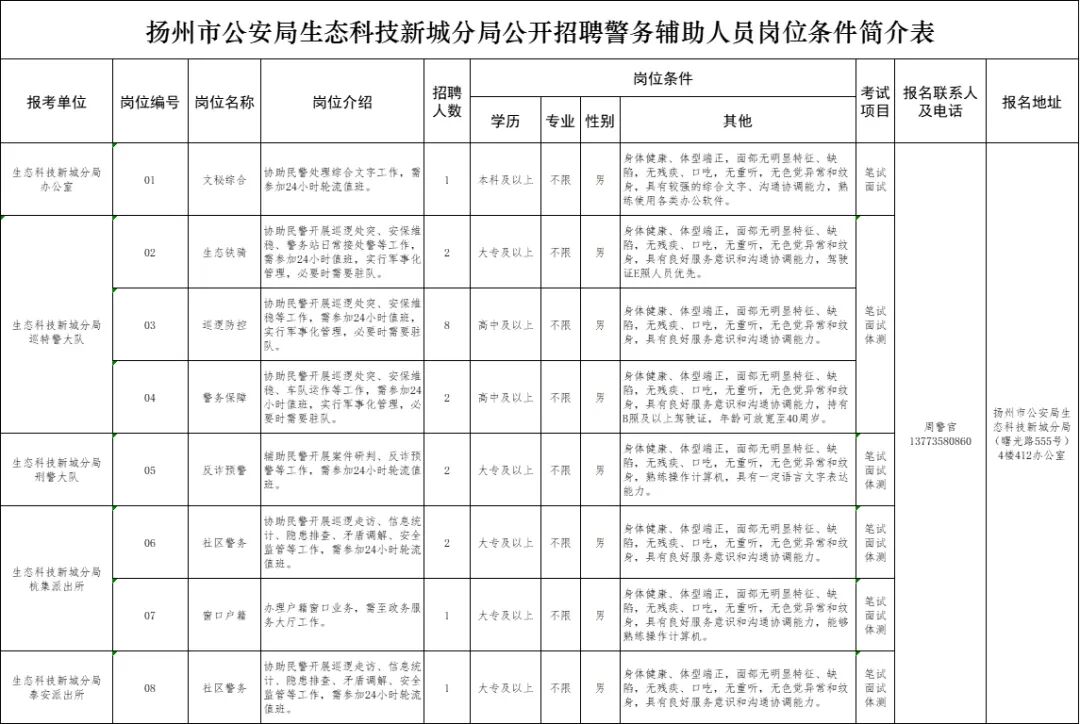 岗位明细和具体条件详见附件1《扬州市公安局生态科技新城分局公开招聘警务辅助人员岗位条件简介表》。