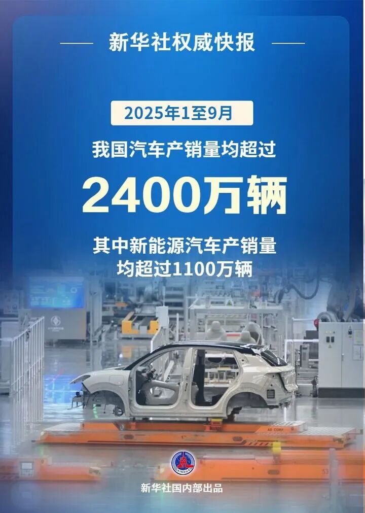 记者10月14日从中国汽车工业协会获悉,2025年1至9月,我国汽车产销量分别为2433.3万辆和2436.3万辆,同比分别增长13.3%和12.9%,汽车市场整体延续良好态势。其中,新能源汽车产销量分别为1124.3万辆和1122.8万辆,同比分别增长35.2%和34.9%,新能源汽车新车销量达到汽车新车总销量的46.1%。