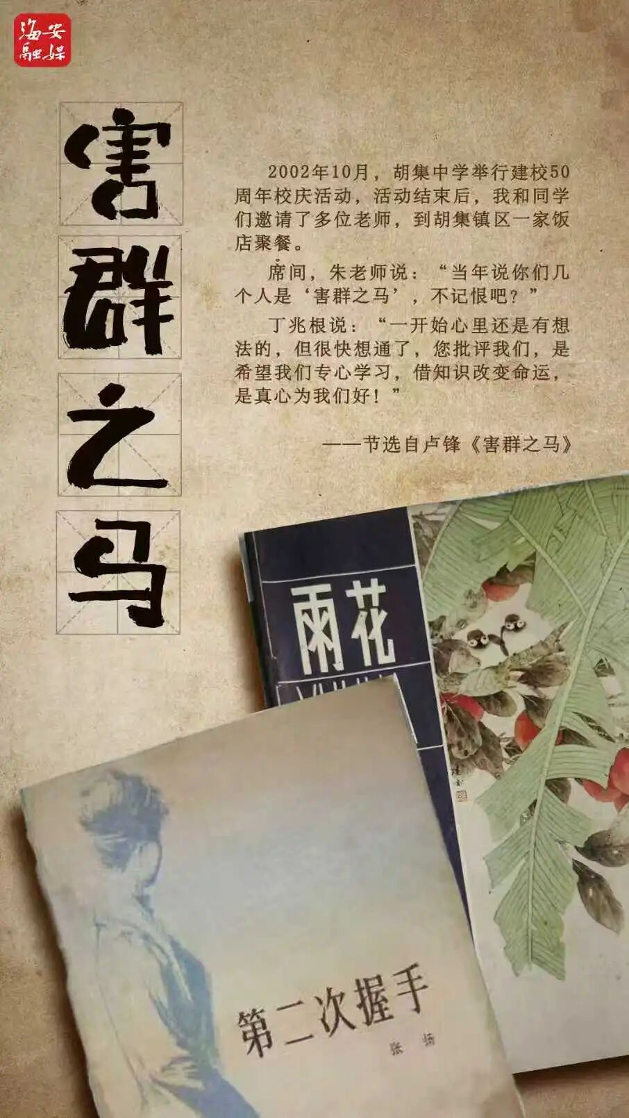 “上次,你带了一本《第二次握手》进教室,讲小说里谈情说爱的故事,扰乱军心。今天,你又拿了本《雨花》,你自己晚自习不好好复习也就罢了,还高声朗读诗歌。有些同学也不自觉,不做作业听你读。你真是个害群之马,而且是班上四个‘害群之马’之首!”《雨花》被朱老师从我手上拿去,他站在讲台上,开始严肃批评我,也批评那些看着我朗读诗歌的同学。