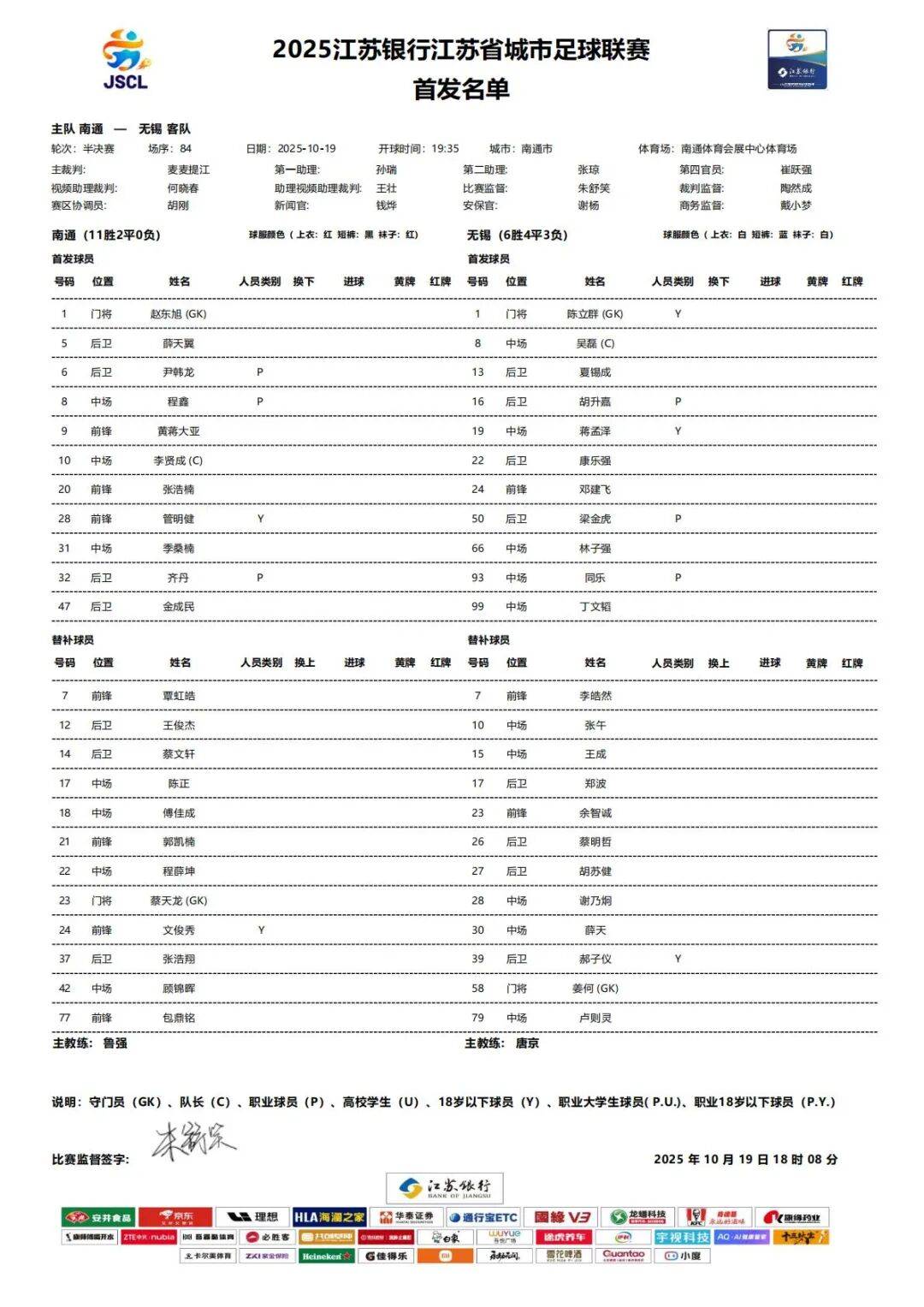苏超半决赛南通VS无锡,首发名单公布
