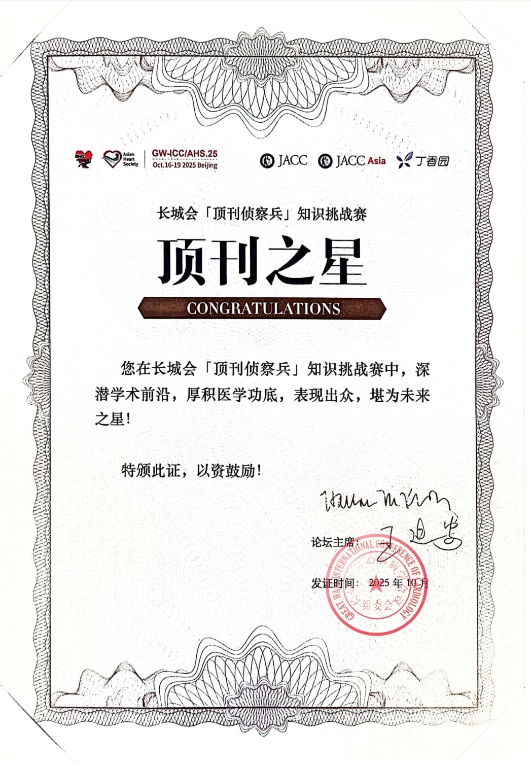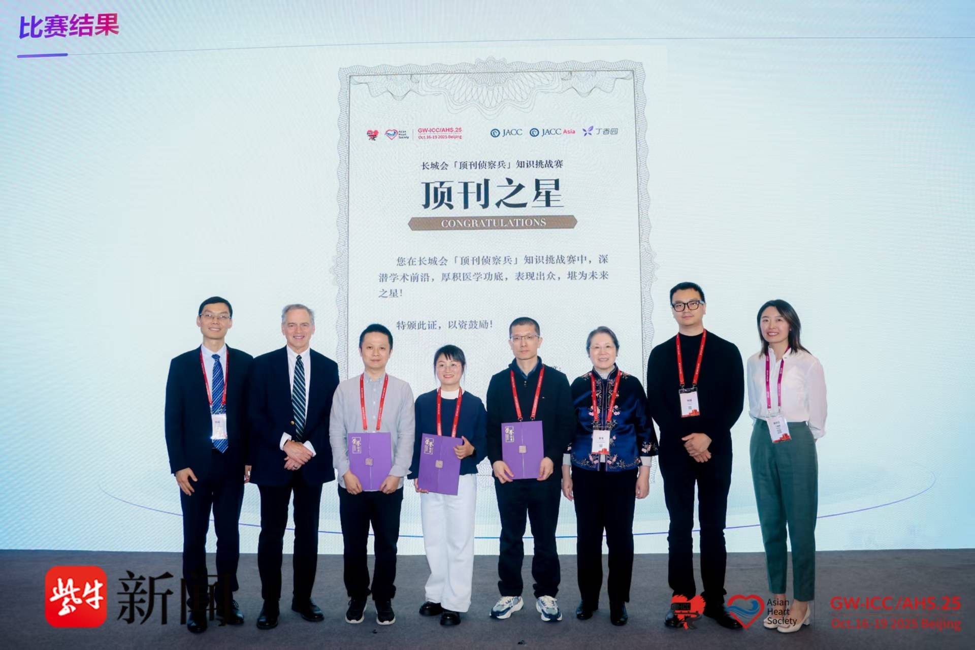 扬子晚报网10月21日讯(通讯员 吴唯 记者 万凌云 姜天圣)在刚刚圆满落幕的第36届长城心脏病学大会(GW-ICC 2025)暨亚洲心脏大会(AHS 2025)上,备受业界关注的“顶刊侦察兵”专场赛圆满收官。10月17日,北京国家会议中心的“长城之星”中央舞台星光熠熠,丹阳市人民医院心血管内科团队与国内顶级医院精英战队同台竞技、巅峰对决。凭借扎实的专业功底、默契的团队协作与出色的临场发挥,最终与顶尖名院浙江大学医学院附属第二医院(浙大二院)并列全国第二名,强势斩获“榜眼”殊荣,为丹阳市人民医院在心血管领域的学术影响力再添浓墨重彩的一笔!