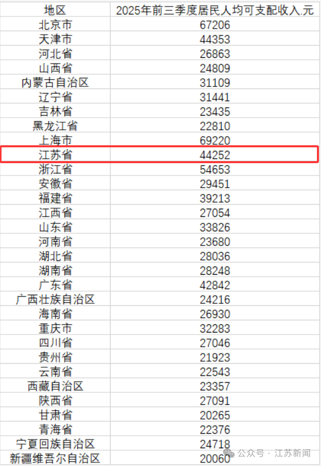 国家统计局网站公布了31个省份2025年前三季度居民人均可支配收入情况。今年前三季度,有11个省份居民人均可支配收入超过3万元。其中,江苏省2025年前三季度居民人均可支配收入为44252元。