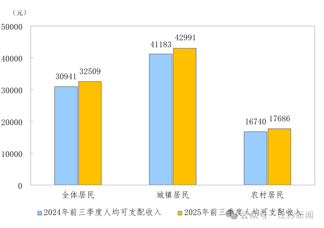 国家统计局20日公布的数据显示,前三季度,全国居民人均可支配收入32509元,同比名义增长5.1%,扣除价格因素实际增长5.2%。按常住地分,城镇居民人均可支配收入42991元,同比名义增长4.4%,实际增长4.5%;农村居民人均可支配收入17686元,同比名义增长5.7%,实际增长6.0%。