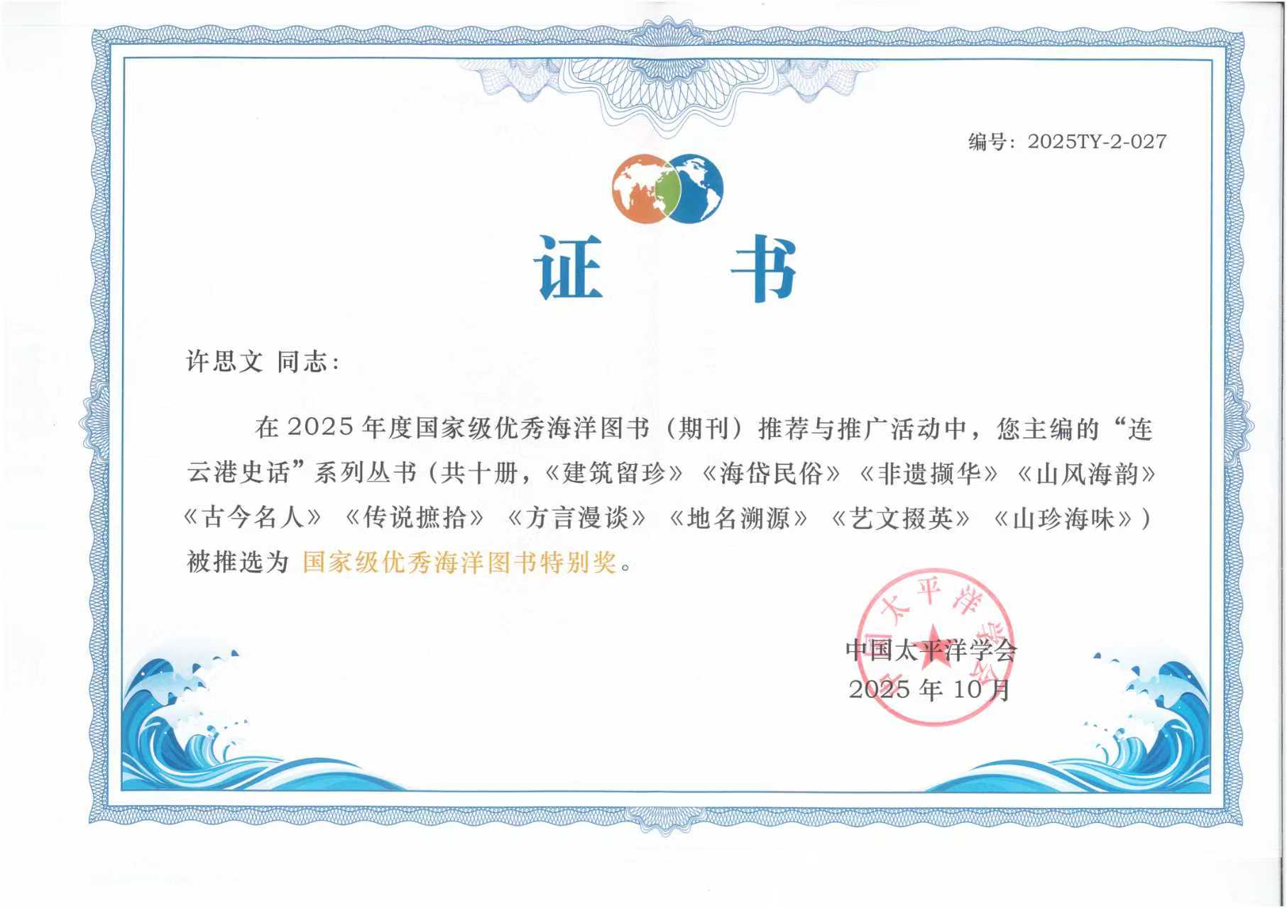 近日,根据国家海洋局等五部门部署,在2025年度中国太平洋学会发起组织的国家级优秀海洋图书(期刊)推荐与推广活动中,由连云港市档案馆党组书记、馆长许思文主编的《连云港史话》十卷丛书被推选为国家级优秀海洋图书特别奖!