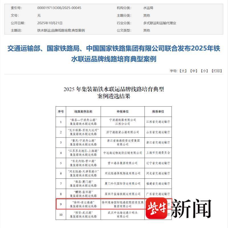 近日,交通运输部、国家铁路局、中国国家铁路集团有限公司联合发布2025年铁水联运品牌线路培育典型案例名单,徐州陆港集团申报的“徐州—连云港港”集装箱铁水联运线路成功入选,也是江苏省唯一入选的线路案例,标志着徐州在国家多式联运体系建设和区域物流枢纽能级提升方面实现重大突破。