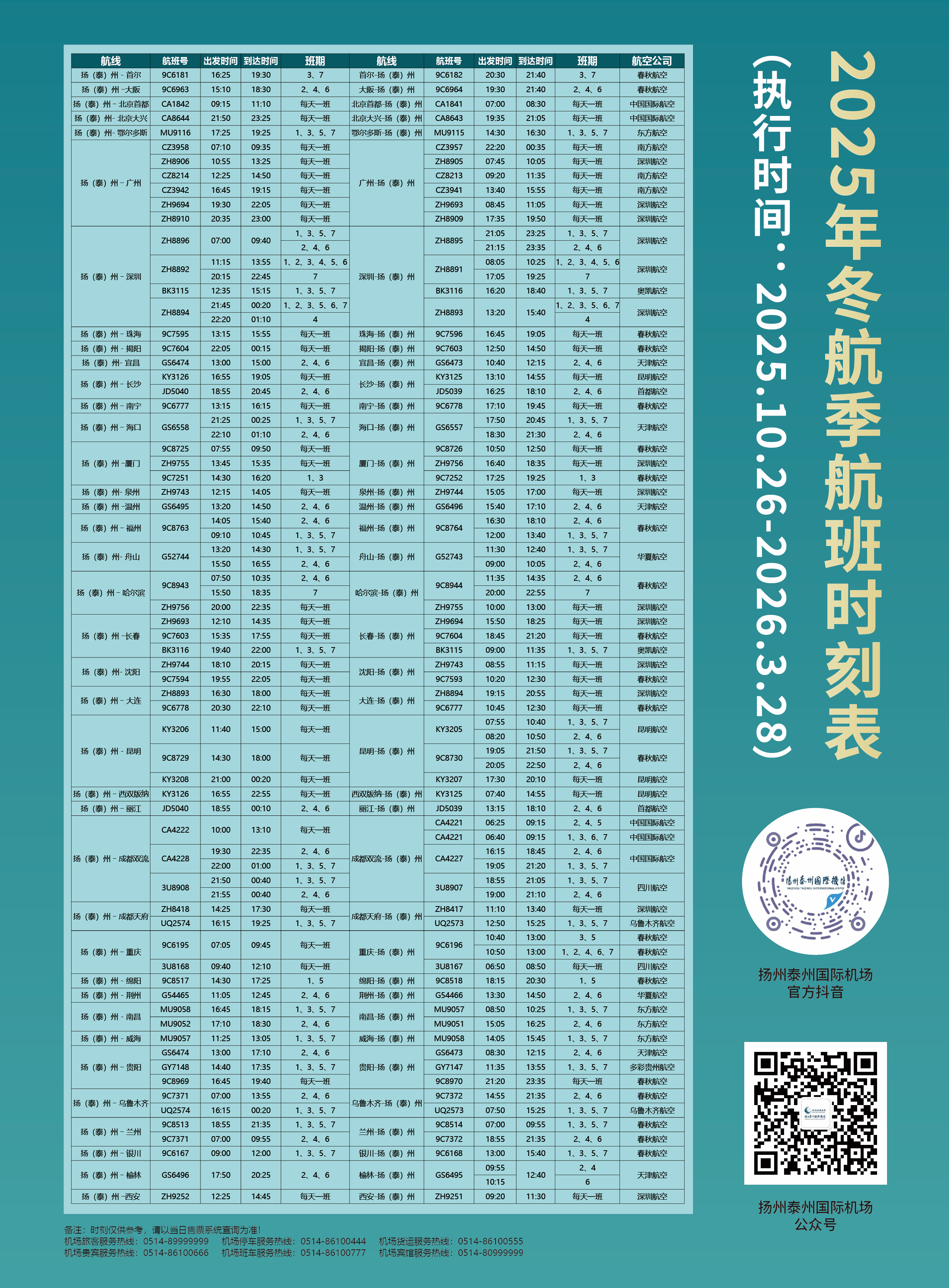 据悉,10月26日,民航迎来2025年冬航季。此次航班换季后,扬泰机场航线网络迎来新一轮提质升级,合作航司达12家,通航36个城市38个机场,过夜运力6架,航线服务能力显著跃升。