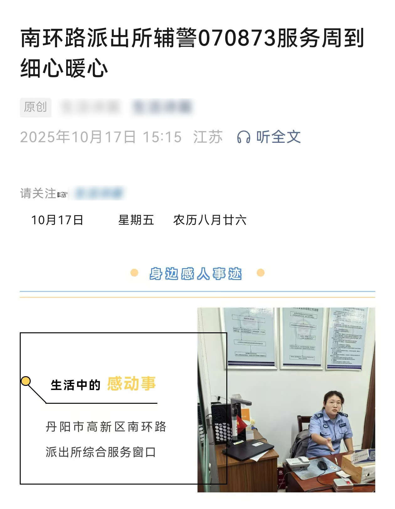 群众 “暖心推文” 赞辅警!丹阳朱海霞补证服务显温度,践行 “以人民为中心” 理念