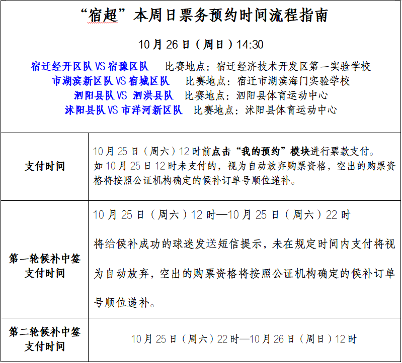 请首轮成功中签的市民和球迷务必注意,票款支付通道现已开启,截止时间为10月25日12时。请在此时间段内,及时进入“我的预约”模块完成支付操作。支付成功后,购票平台“我的券码”内将更新票务信息。