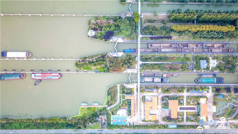 10月22日,京杭大运河宿迁市湖滨新区皂河段,货船有序通过皂河船闸,黄金水道运输一片繁忙。