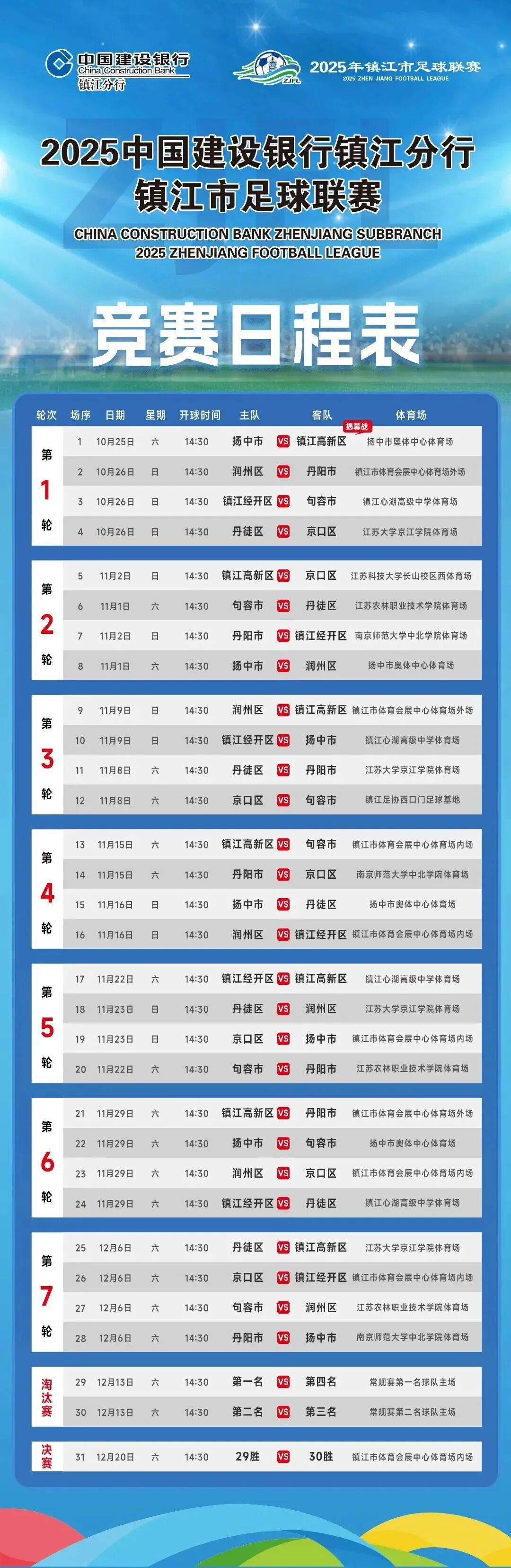 据镇江市体育局介绍,作为本土重点赛事,“镇超”联赛旨在将足球热潮延伸至各区县,夯实足球基础,同时以赛事带动全民健身与城市文体旅商深度融合,传递镇江足球热血活力。本届联赛覆盖镇江全市八个板块,采用主客场制,分常规赛、淘汰赛两阶段。常规赛由各市(区)承办,淘汰赛将依据常规赛成绩在排名较高球队所在地举行,冠亚军决赛定于12月在镇江市体育会展中心进行。