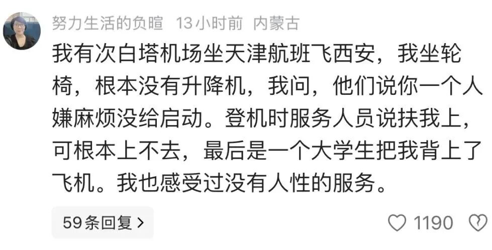 10月25日,歌手郑智化在微博发文表示,自己在深圳机场乘坐航班时,升降车升至机门后离机门地板有25厘米距离,导致其轮椅无法推入飞机。而操纵升降车的司机不愿把升降板提高,冷眼看着他“连滚带爬”进飞机。此事在网络上引起关注和热议。