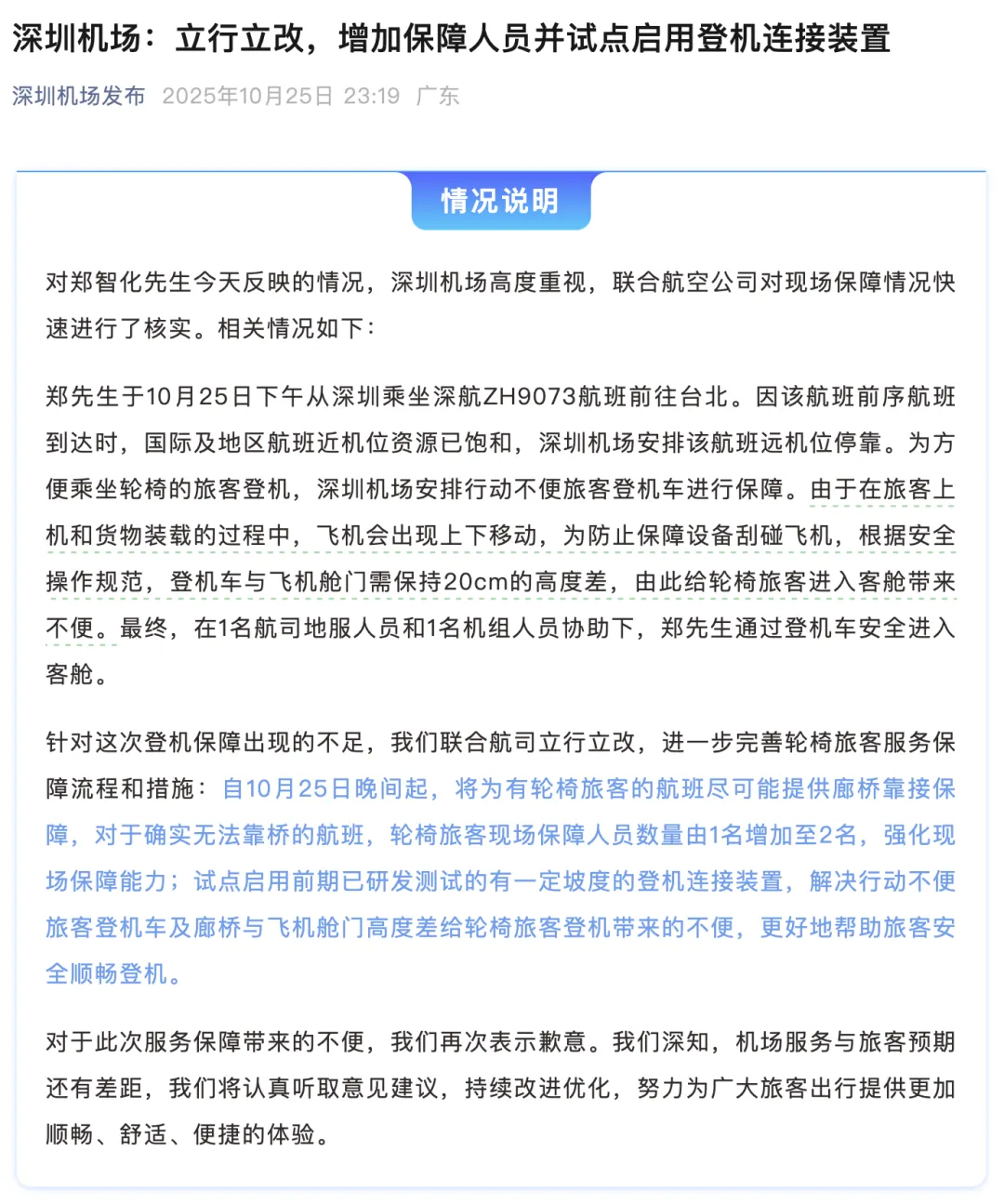 10月25日晚,深圳机场发文称将立行立改,增加保障人员并试点启用登机连接装置。全文如下: