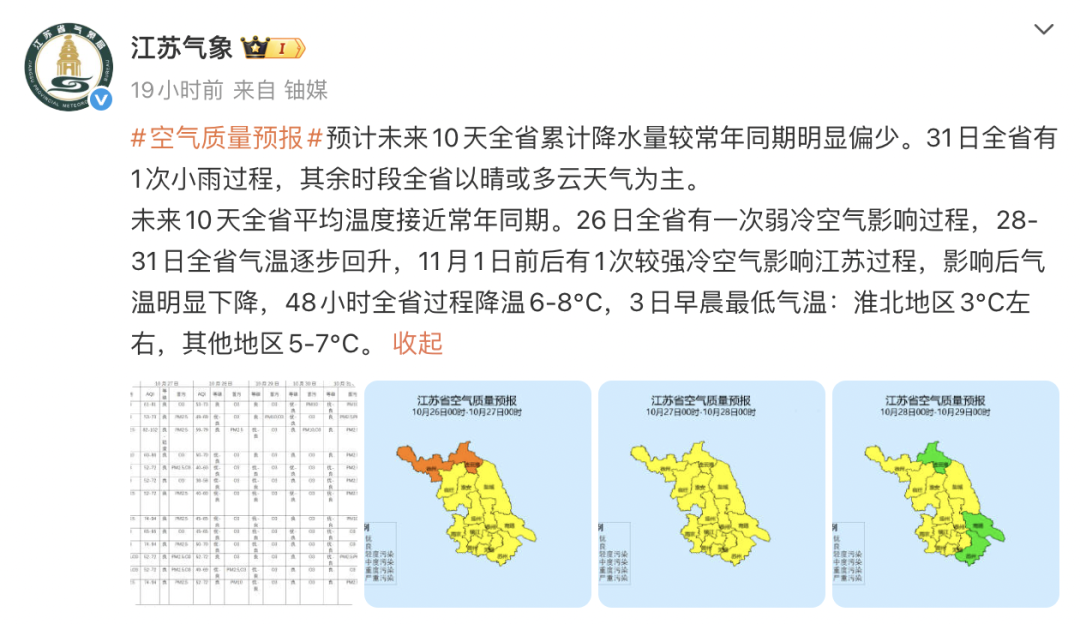 未来10天全省平均温度接近常年同期。26日全省有一次弱冷空气影响过程,28-31日全省气温逐步回升,11月1日前后有1次较强冷空气影响江苏过程,影响后气温明显下降,48小时全省过程降温6—8℃,3日早晨最低气温:淮北地区3℃左右,其他地区5—7℃。