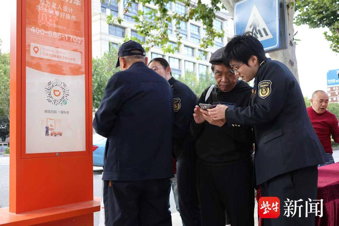在江南府邸小区门口的社区助老车站台,镇江市交通运输综合行政执法支队的党员在为居民介绍“助老车站”项目的实施情况。“扫这个二维码,然后这样操作就可以了。”交通执法人员向社区老人演示微信扫码一键叫车、电话叫车和子女代叫功能,手把手教老人们操作。