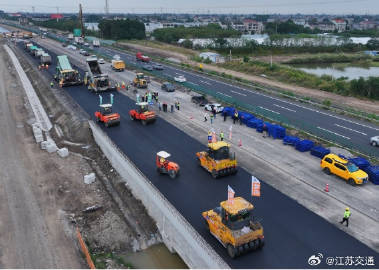 京沪高速公路广靖改扩建工程沥青下面层首件摊铺完成