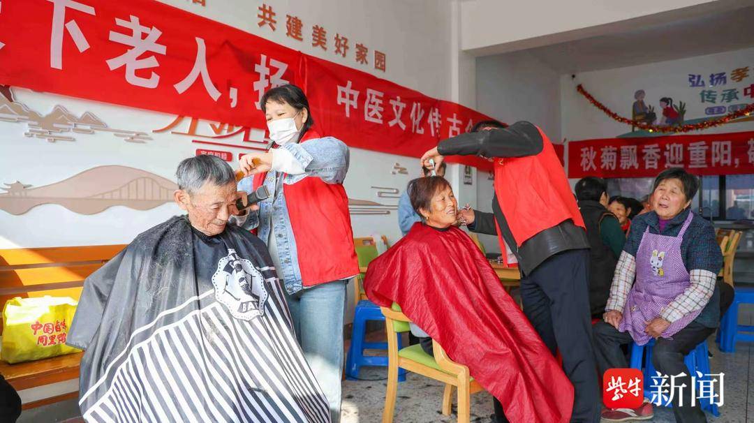 盐东居养老睦邻点内,银发老人欢聚一堂,造型师志愿者用一把剪刀、一张围布、一把梳子、一把椅子传递着温暖和关爱。志愿者与老人一边聊生活、话家常,一边耐心细致地修剪出适合老人的发型,现场气氛欢乐祥和,充满温情。在造型师的修剪下,一个个“崭新的面孔”呈现在大家眼前,老人个个变得精神抖擞,脸上洋溢着灿烂的笑容。同时,网格员们向参加活动的居民面对面宣传了区、镇两级综治中心以及网格化工作服务及防范电信诈骗等相关内容。
