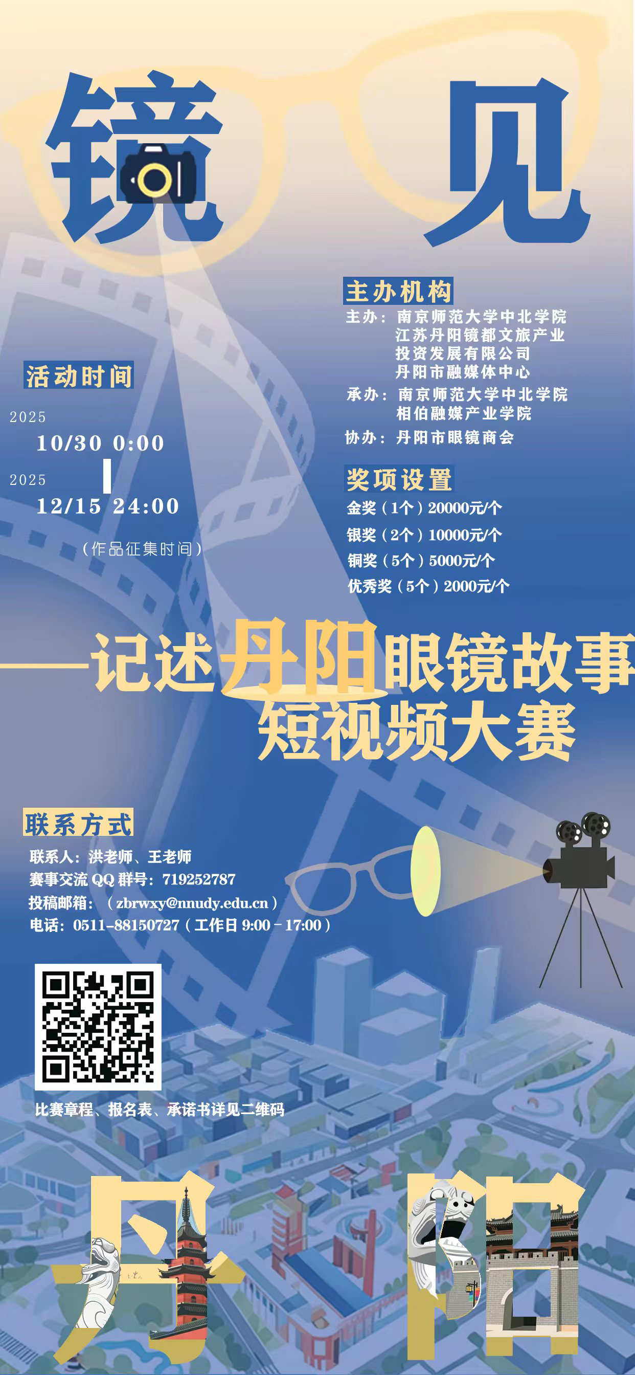 本次大赛在中共丹阳市委宣传部、丹阳市文体广电和旅游局指导下,由南京师范大学中北学院相伯融媒产业学院承办,丹阳市眼镜商会协办,旨在通过影像讲述丹阳眼镜产业背后的匠人精神、创新活力与人文温度,让眼镜成为展现城市形象、传递文化自信的“透明画布”。