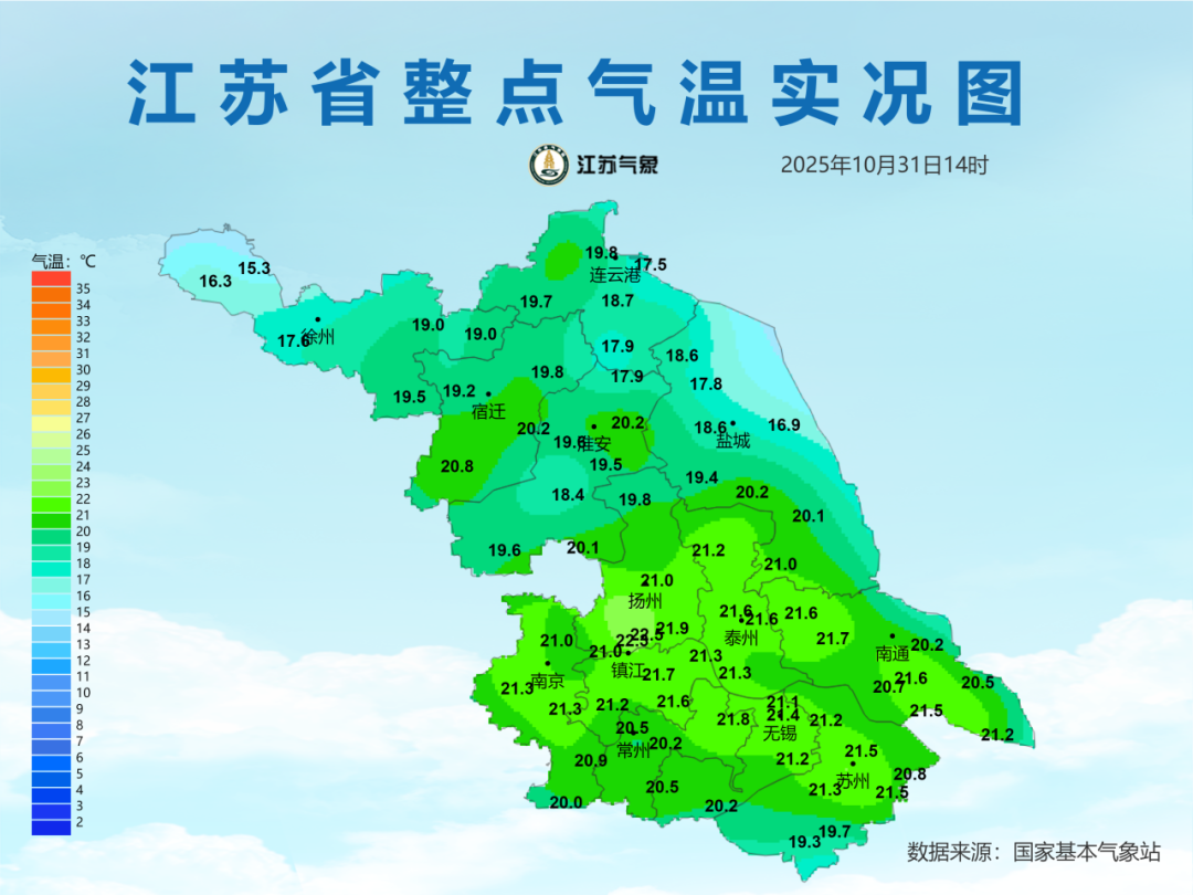 全省多云到晴。最高温度:本省西部地区21~22℃,其他地区20℃左右;最低温度:淮北北部地区7~8℃,苏南地区12℃左右,其他地区9~10℃。全省偏西风3-4级。