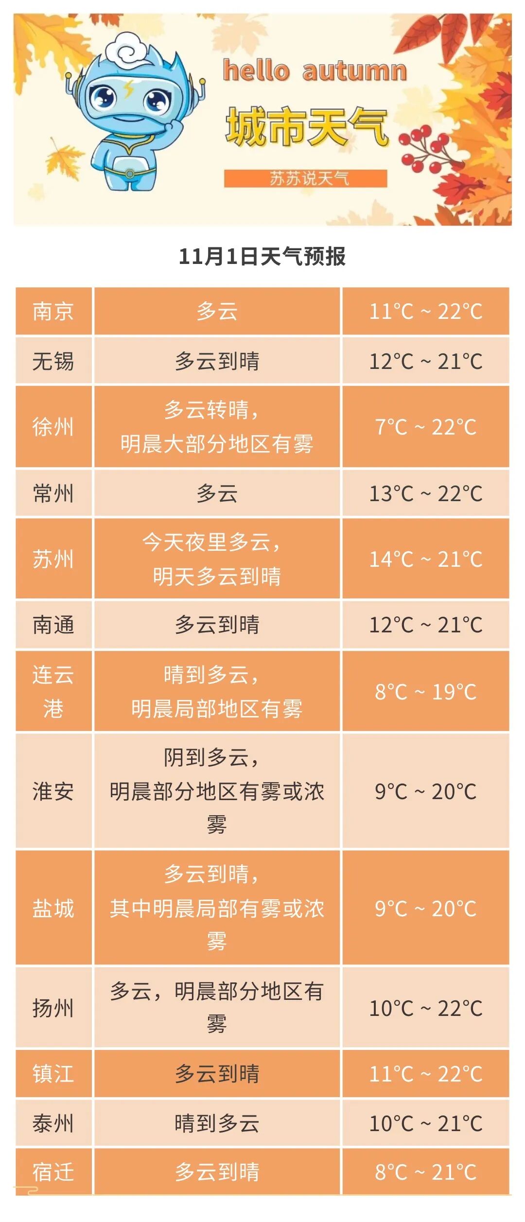 未来三天全省以晴为主,气温有所下降;明晨沿淮和淮北地区局部有雾或浓雾