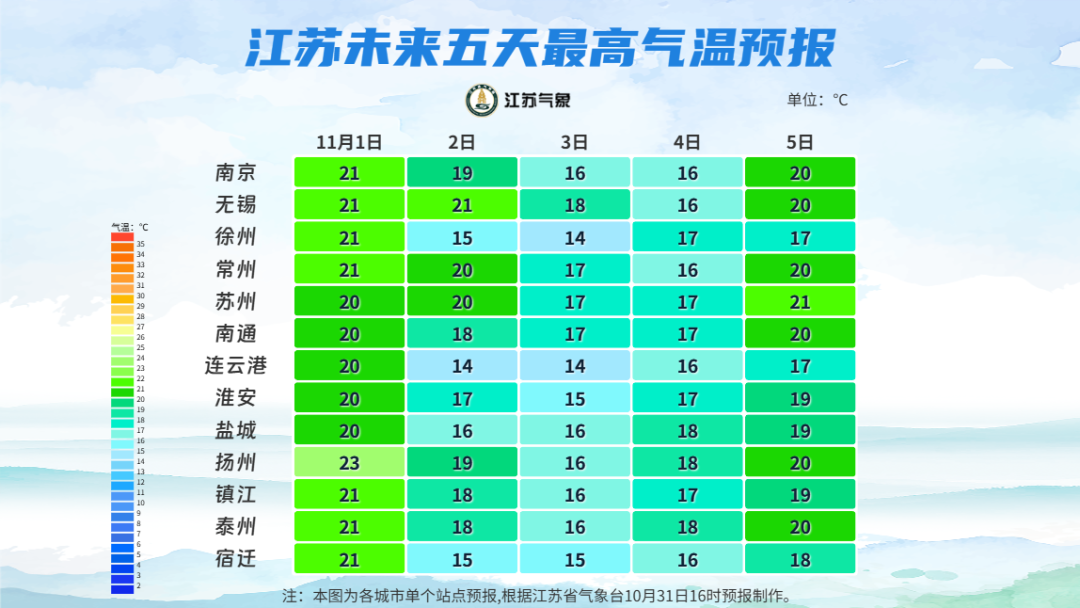 全省晴到多云。最高温度:沿江和苏南地区19~20℃,淮北地区15℃左右,其他地区18℃左右;最低温度:沿淮和淮北地区8~9℃,其他地区11~12℃。全省偏西风转偏北风,风力:3-4级逐渐增强至4-5级阵风6级。
