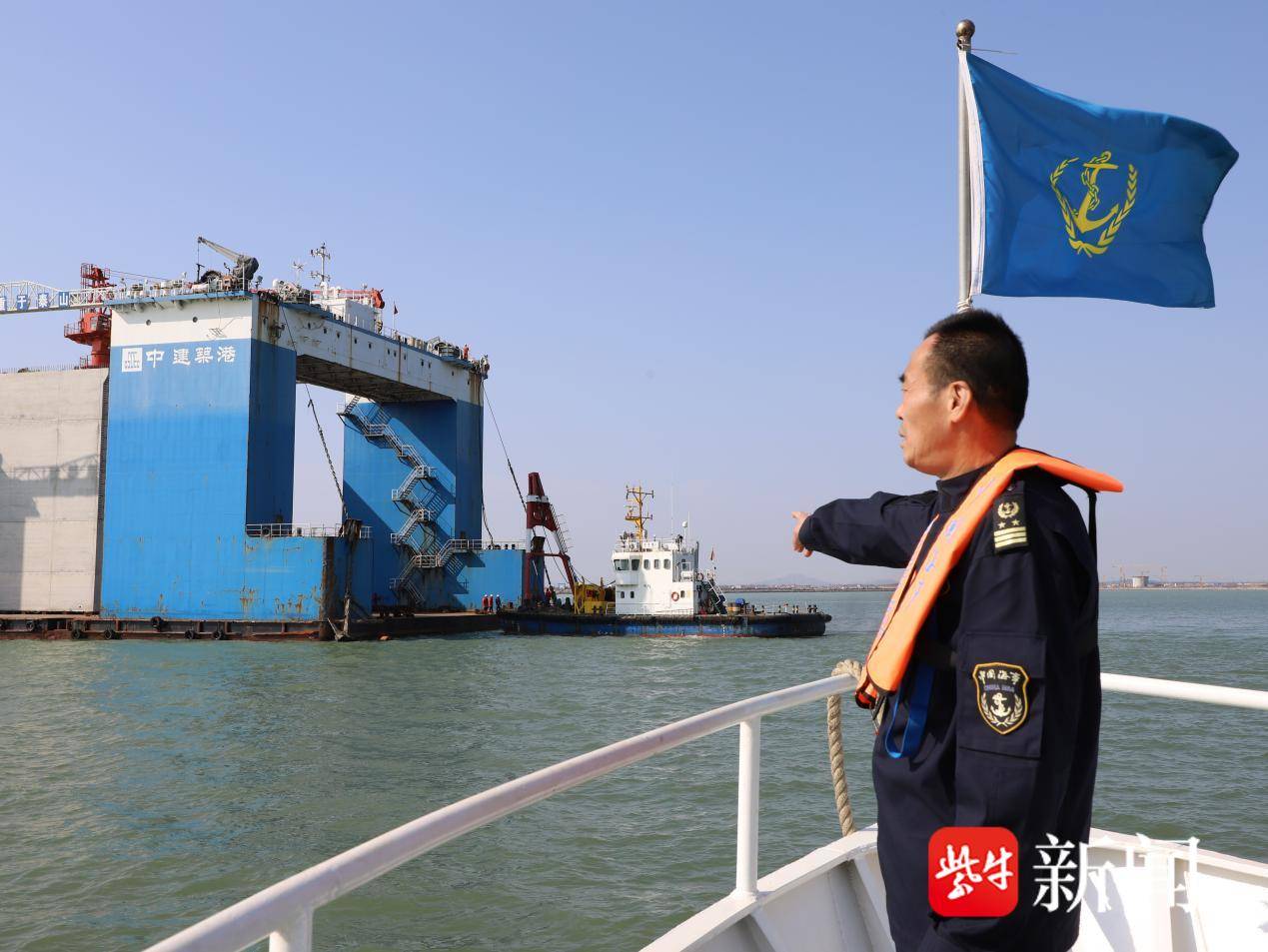该项目本阶段出运安装的沉箱共30件,用于码头主体结构建设,单件最大重达2799吨,过程中采用高压气囊顶升移运工艺,利用方驳定位结合精密测量系统,实现厘米级精准安装。为保障沉箱出运安装安全,连云港海事局提前组织专家对天气海况条件进行研判,制定专属通航安全保障方案,对作业区域进行临时交通管制,调派海巡艇进行现场警戒护航,充分利用智慧海事监管系统、无人机对参与作业施工船和周围船舶进行动态监控,并在作业过程中提供指导和安全提醒。