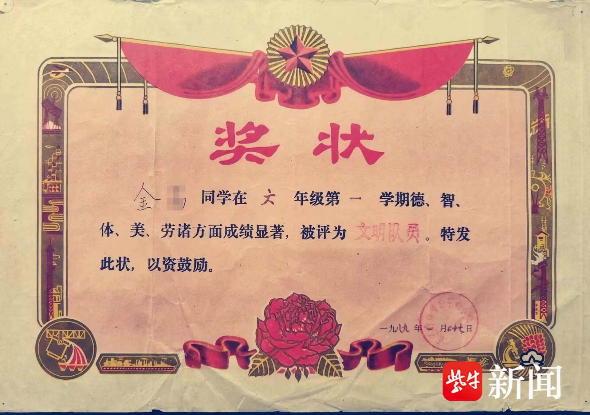 故事的缘起,是收藏爱好者戴先生一次偶然的发现。不久前,他在整理藏品时,被一张百年老校中华路小学六年级优秀队员的奖状吸引住了目光,奖状边缘虽有些磨损,字迹却依然清晰,纸面上的写着“金XX同学在六年级第一学期,德、智、体、美、劳诸方面成绩显著,特发此证,以资鼓励。”落款日期1989年1月27日。奖状的四周有图钉钉过的圆形印记,想必当初家里应该是把奖状钉在显眼的地方的,既是家庭的荣耀,也是激励自己的动力。