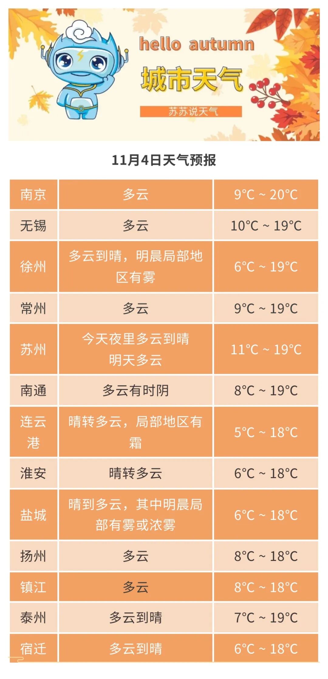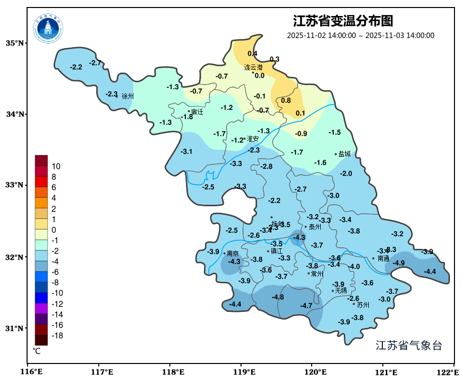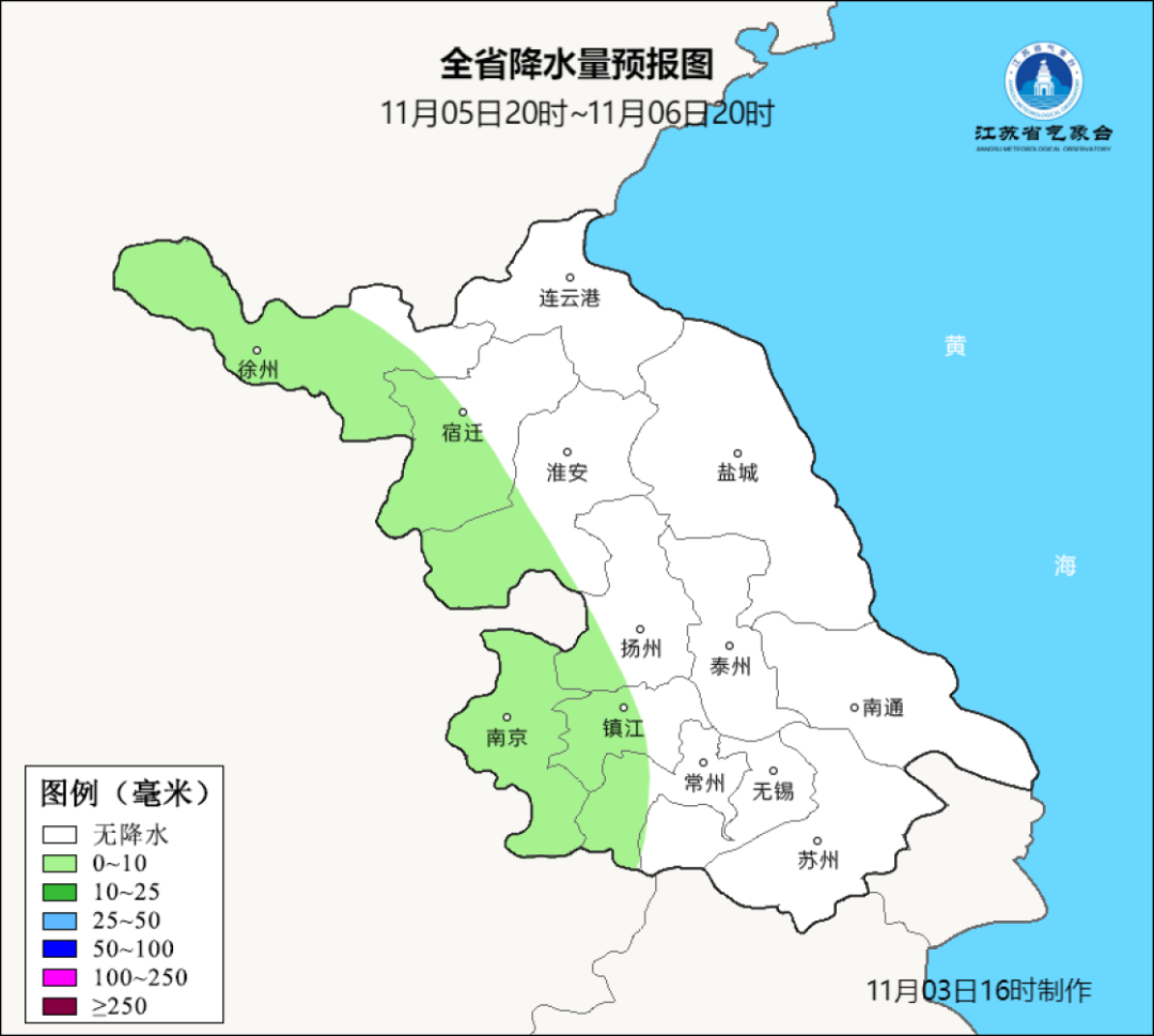 最低温度:淮北地区5~6℃,苏南地区9~10℃,其他地区7~8℃。全省偏东风3-4级。