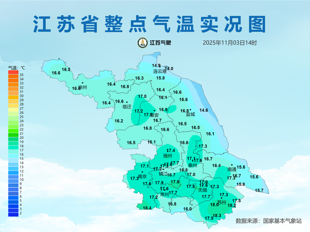 全省大部分地区在14-16℃上下