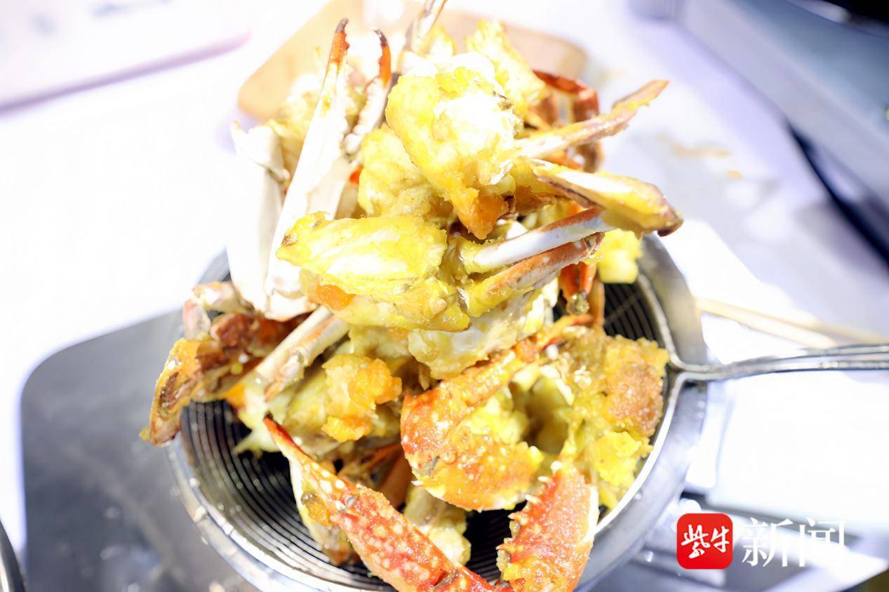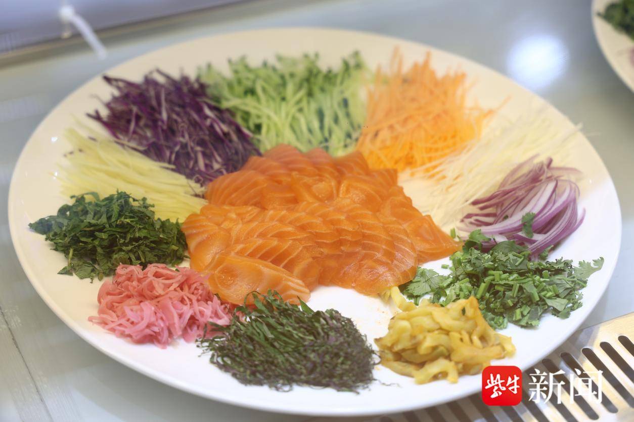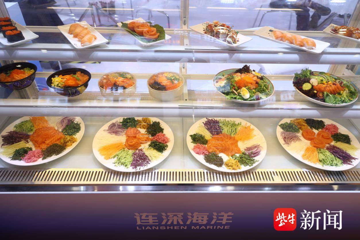 现场展示的梭子蟹、三文鱼制作的各类美食