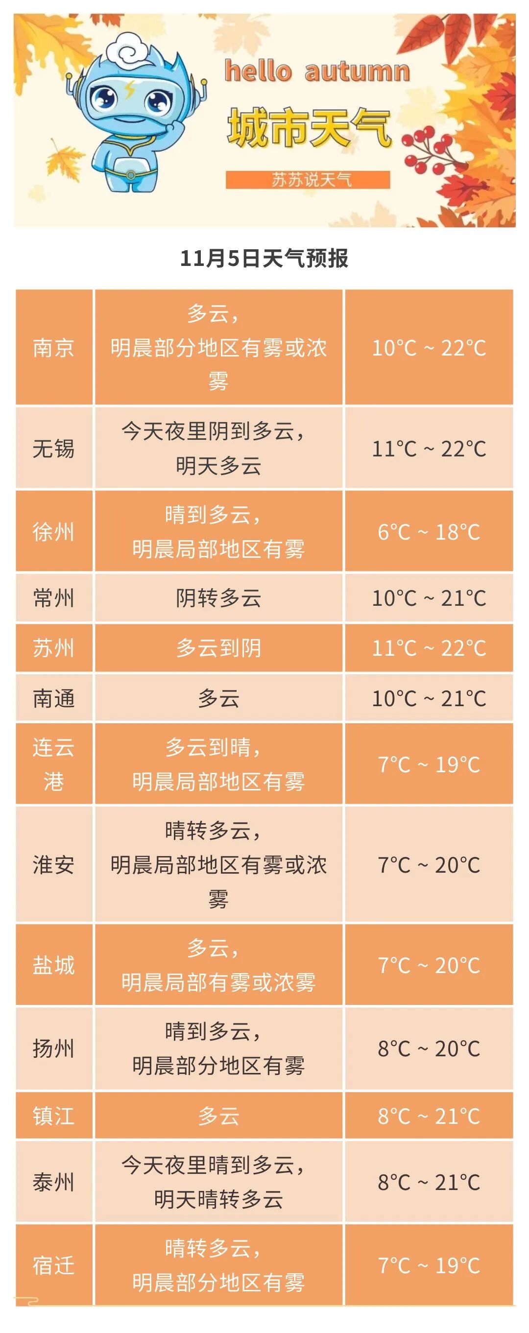 最低温度:沿淮和淮北地区6~7℃,其他地区9~10℃。全省偏东风4级左右。