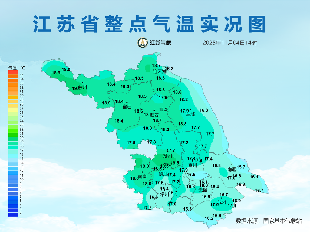 最低温度:淮北地区13℃左右,苏南地区17℃左右,其他地区14~15℃。全省偏东风4级左右。