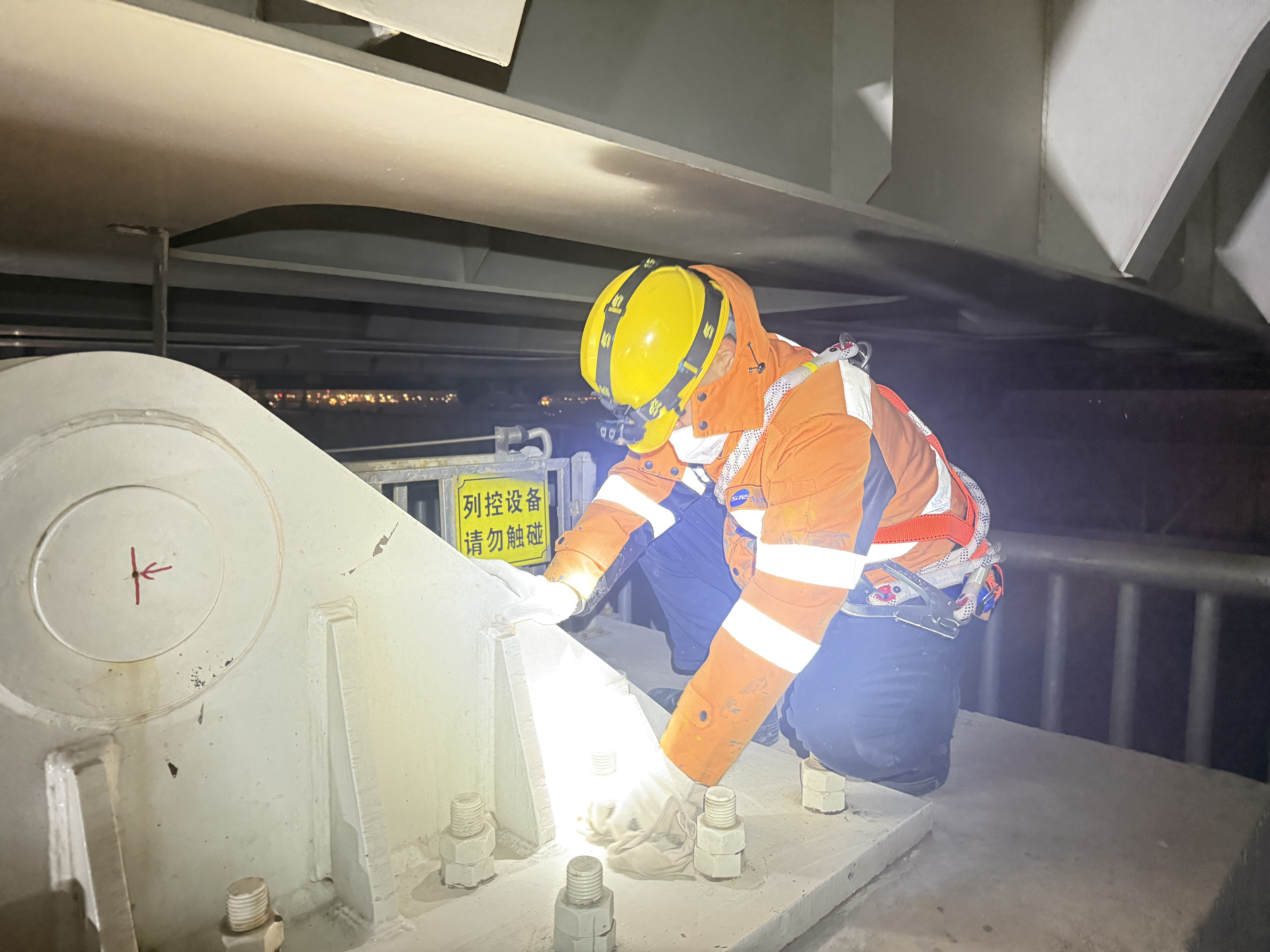 到了作业地点,职工们系好安全带,顺着竖梯爬向墩台,认真检查桥梁支座及反底面。躬身、侧行、攀爬,职工们不断地钻过墩台上狭窄的过道,往复在不同的作业地点。
