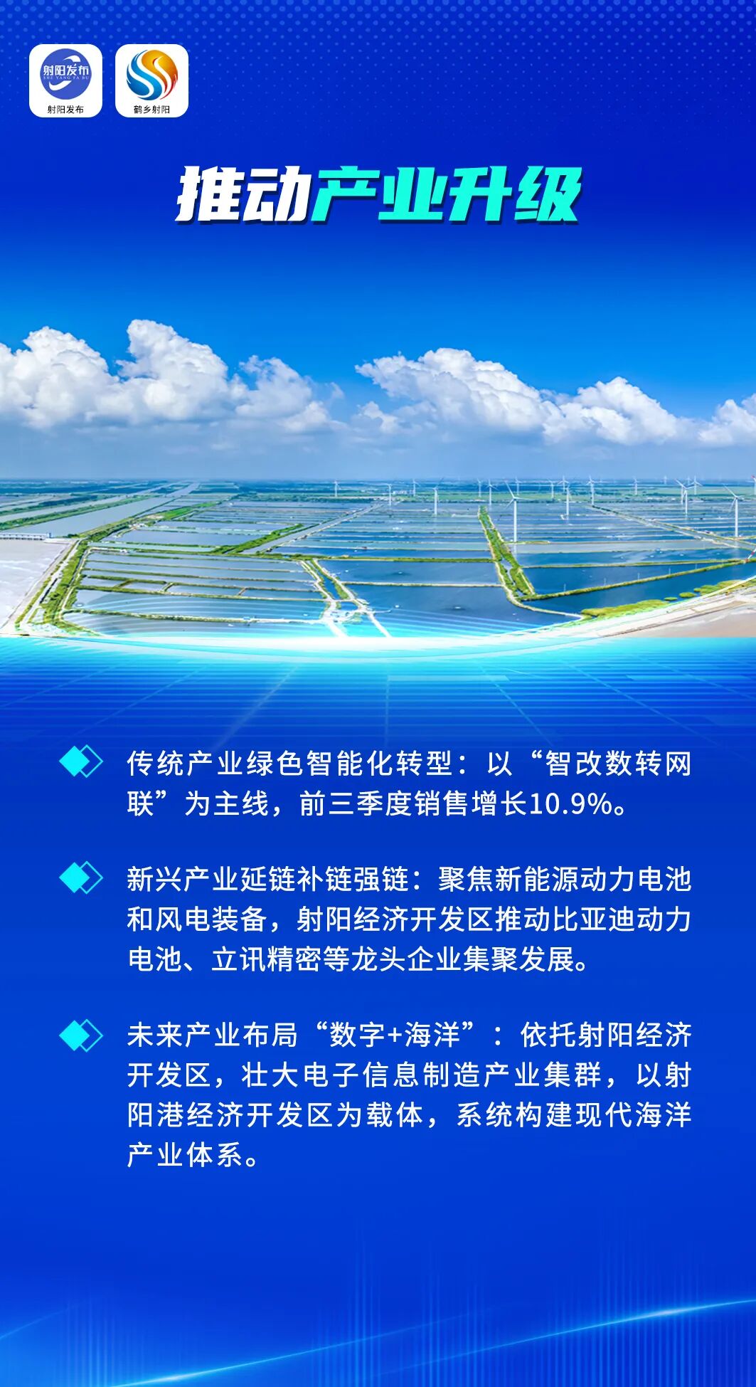 未来产业积极布局。聚焦“数字”与“海洋”两大战略方向,实施双轮驱动。依托射阳经开区,围绕立讯精密、暖阳半导体等骨干企业,壮大电子信息制造产业集群,打造“数字产业新高地”。以射阳港经济开发区为载体,系统构建现代海洋产业体系,培育海洋高端装备和新能源等产业。