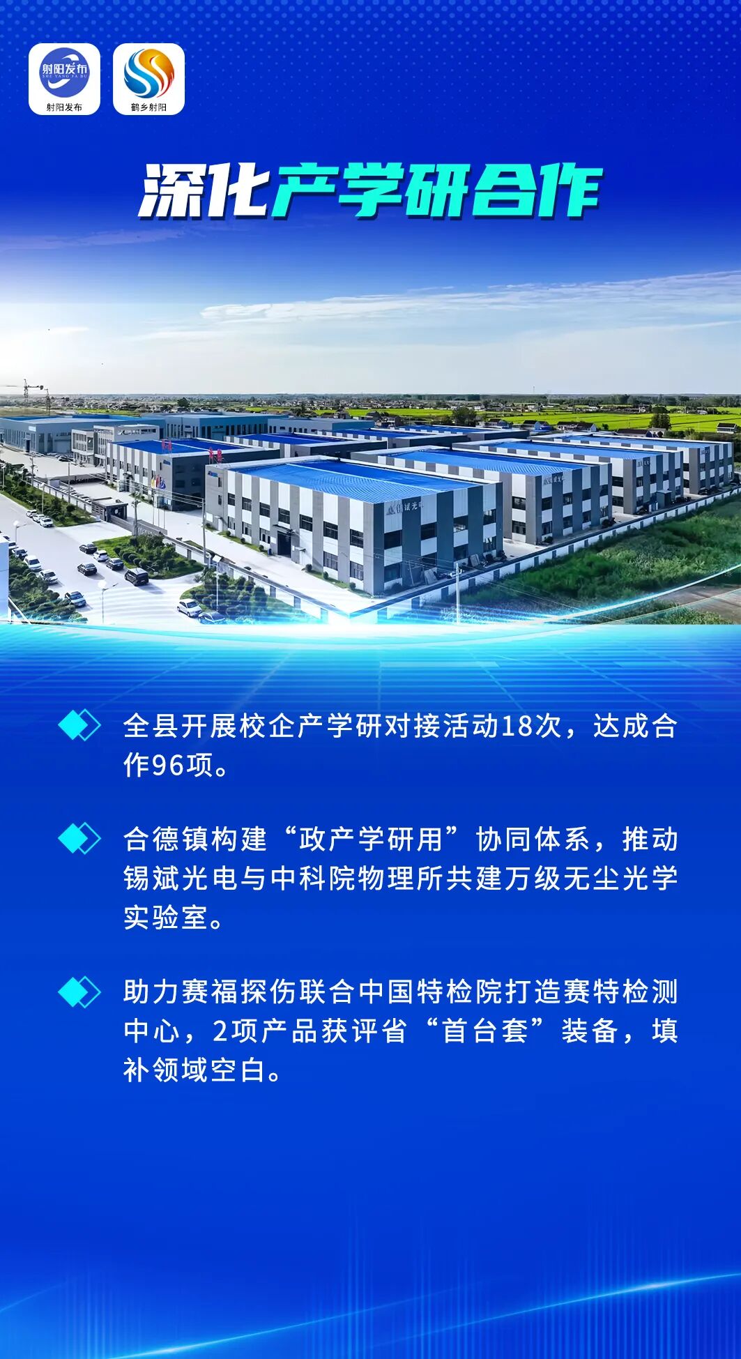 深化产学研合作。今年以来,射阳县开展校企产学研对接活动18次,达成合作96项。合德镇作为县域创新发展中坚力量,更是紧扣高质量发展要求,围绕电力电气、健康医疗和无损探伤,构建“政产学研用”协同体系,推动锡斌光电与中科院物理所共建万级无尘光学实验室,研制出国内首台腔体精度≤2秒、表面粗糙度≤0.1纳米的超精密抛光机;助力赛福探伤联合中国特检院打造赛特检测中心,2项产品获评省“首台套”装备,填补领域空白。