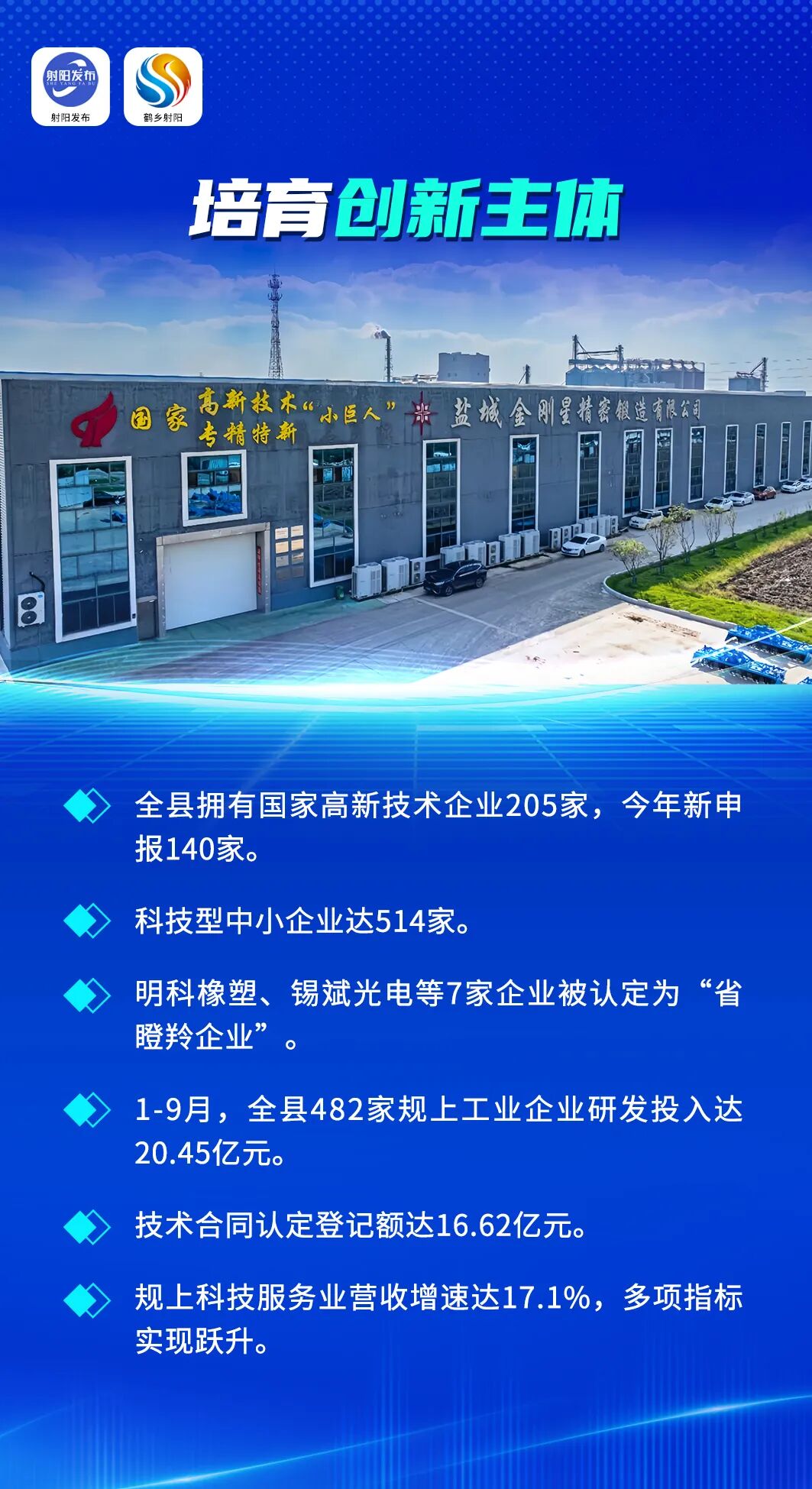 射阳县科技局党组书记、局长胡长春介绍, 1-9月,全县482家规上工业企业研发投入达20.45亿元,总量位居全市第二;技术合同认定登记额达16.62亿元,规上科技服务业营收增速达17.1%,多项指标实现跃升。