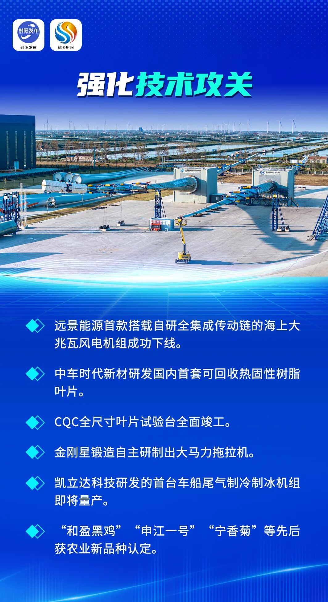 加强技术攻关。支持重点企业与高校院所按照“优势互补、领域匹配”原则共建高能级实验室,加快产业链前沿先进技术研发和攻关。在一系列努力下,标志性成果相继涌现:远景能源首款搭载自研全集成传动链的海上大兆瓦风电机组成功下线;中车时代新材研发国内首套可回收热固性树脂叶片;CQC全尺寸叶片试验台全面竣工;金刚星锻造自主研制出大马力拖拉机;凯立达科技研发的首台车船尾气制冷制冰机组即将量产;“和盈黑鸡”“申江一号”“宁香菊”等先后获农业新品种认定。