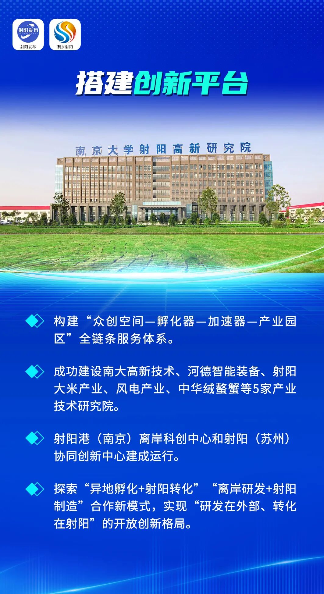 打造创新平台。以新能源、电子信息与智能装备等新兴主导产业和传统优势农业为方向,成功建设南大高新技术、河德智能装备、射阳大米产业、风电产业、中华绒螯蟹等5家产业技术研究院。射阳港(南京)离岸科创中心和射阳(苏州)协同创新中心建成运行,探索“异地孵化+射阳转化”“离岸研发+射阳制造”合作新模式,实现“研发在外部、转化在射阳”的开放创新格局。