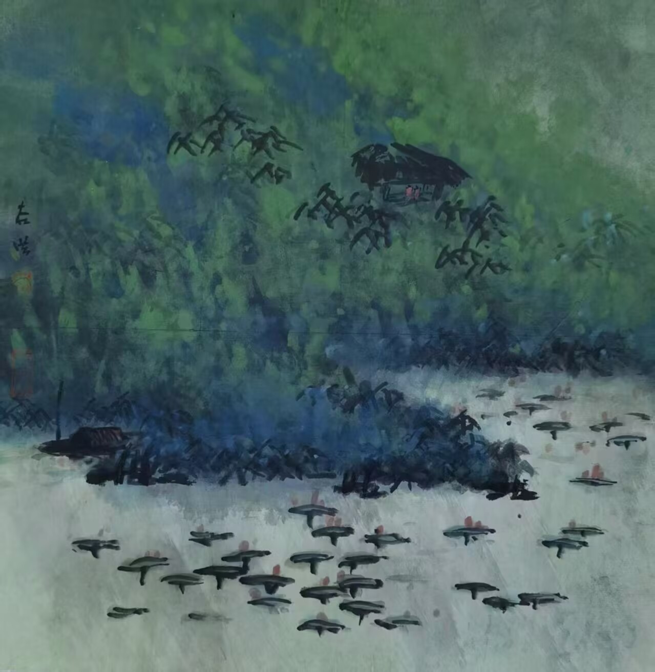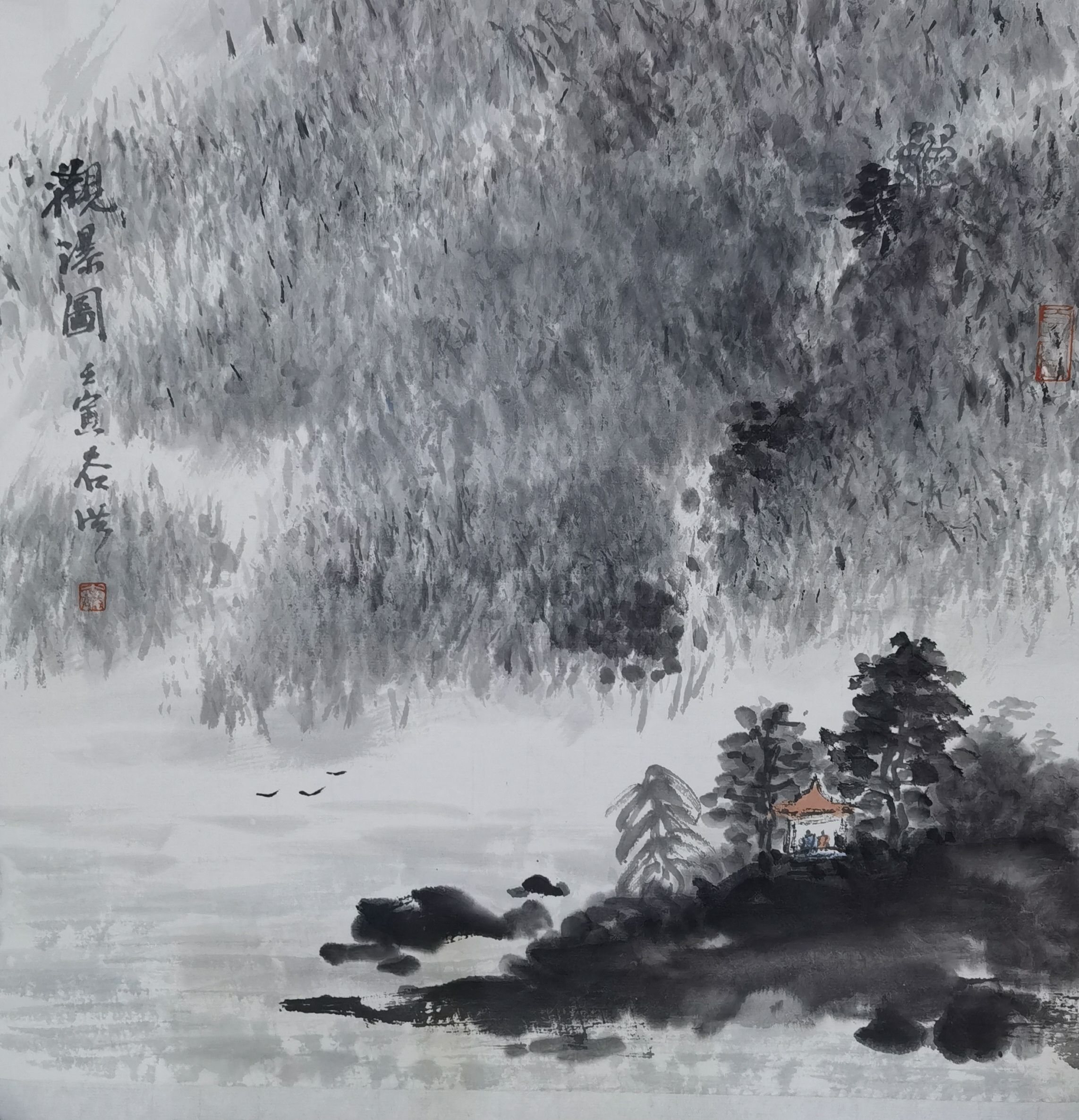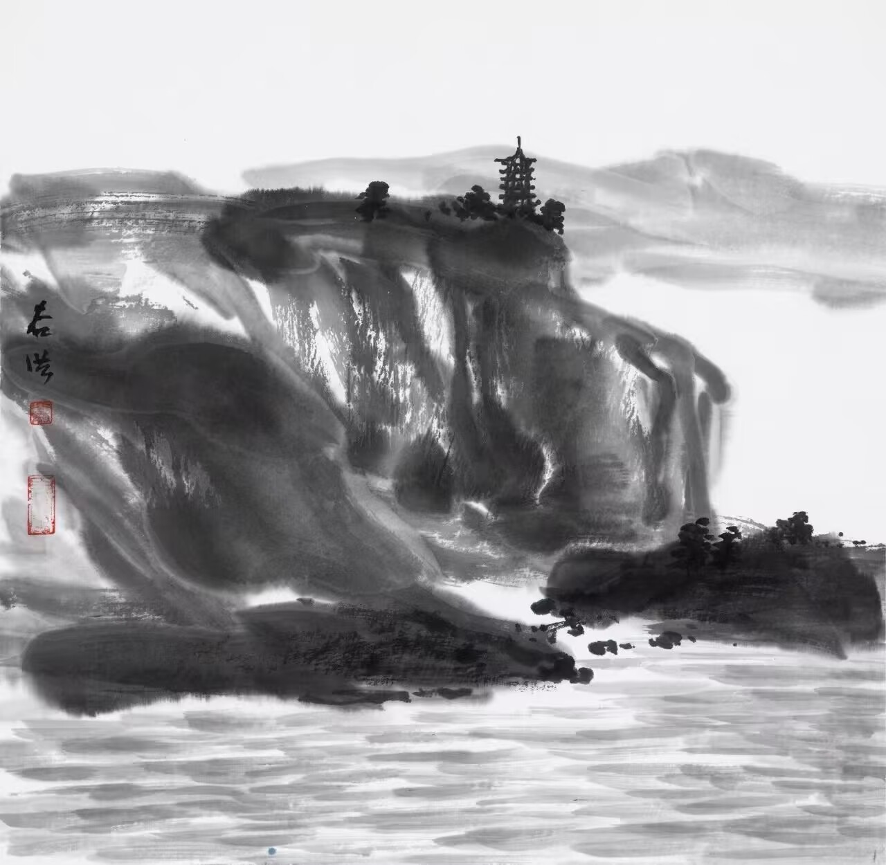 谷洪此次参展的作品,完美诠释了序言中 “格法中寻神采,富丽中觅清灵” 的评价,尽显其艺术创作的最新境界。代表作《轻烟远眺》以简约笔墨勾勒江南山水灵秀之气,远山隐现于云雾间,虚实相生、意境悠远。画家巧妙运用留白手法,让云雾成为画面气脉,将 “笔墨开合与画意抒绘融为一体” 的艺术追求展现得淋漓尽致,既可见宋元山水画精髓的传承,又不乏鲜明个人风格。《观瀑图》则凸显 “以书入画” 的特色,树木枝干以书法笔意绘就,挺拔有力,枝叶分布自然生动,瀑布以流畅笔触表现出水流动感,整幅作品气韵贯通,彰显出对笔墨语言的精准把控与对自然生命的深刻理解。《曲院风荷》作为园林小景佳作,构图精巧、色彩清雅,在坚守水墨韵味的同时融入现代审美情趣,以 “沉静中以求秀逸意象营构”,契合了展览 “赋予日常都市意象以沉郁诗意” 的期许。