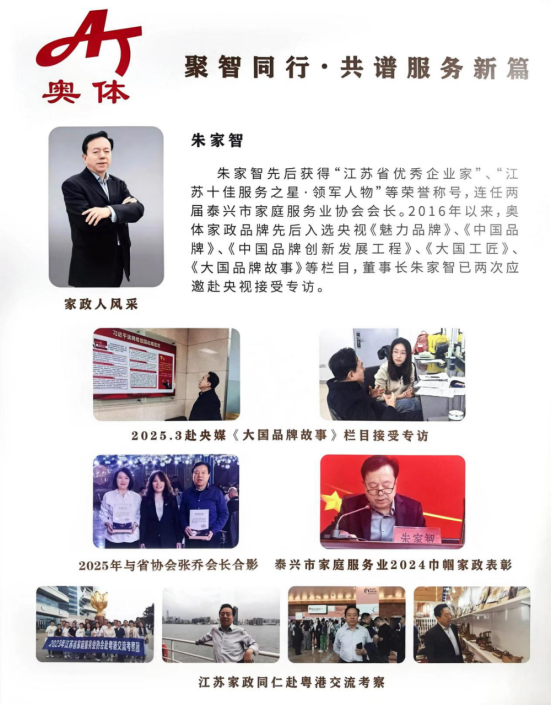 在泰兴家政行业的璀璨星河中,“奥体家政” 早已超越单纯的服务品牌范畴,成为百万市民生活中最坚实的民生依托。从家庭照料到政企后勤,从就业帮扶到城市服务,这家深耕行业26年的企业,以不可替代的民生贡献,成为泰兴家政服务业的标杆旗帜,更吸引了中央电视台 17 频道《大国品牌故事》栏目的聚焦。近期,栏目播出的奥体家政董事长朱家智 26年坚守初心的专题报道,让这份扎根泰兴的品牌力量传遍全国。而镜头之外,通过2025 年4 月20日至 23日摄制组在泰兴连续三日的走访,更蕴藏着奥体家政品牌成长与城市温度交织的动人花絮。