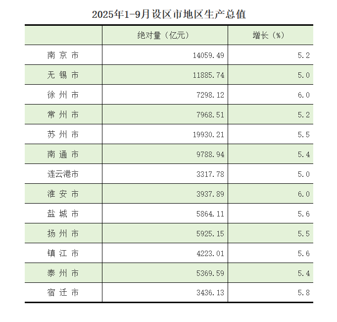 扬子晚报网11月10日讯(记者 徐昇)11月10日,记者从江苏省统计局获悉,2025年1-9月,江苏13个设区市GDP已全部出炉。截至前三季度,苏州、南京、无锡GDP总量均已超万亿。从增速来看,徐州、淮安齐领跑,以6.0%的增速并列位居全省首位。