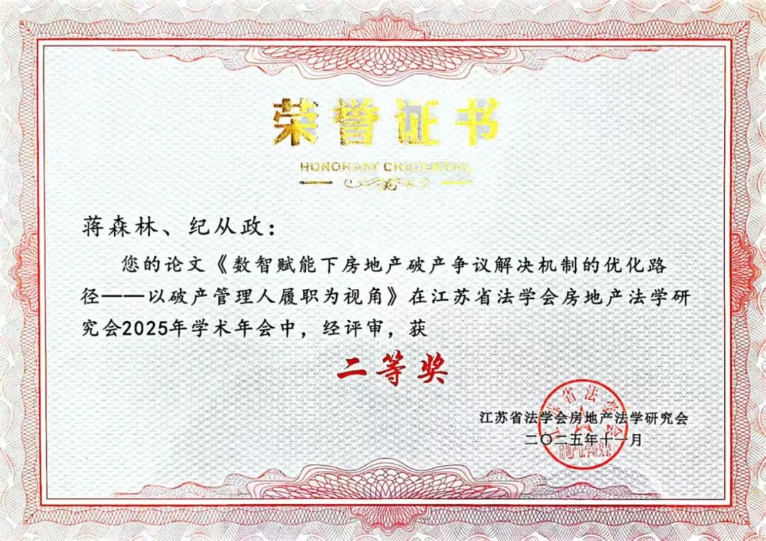 与会嘉宾围绕年会主题展开了热烈讨论。经组委会评审,江苏江成律师事务所提交的2篇论文脱颖而出,分别荣获二等奖、三等奖。2篇论文分别是高级合伙人蒋森林律师、纪从政律师撰写的《数智赋能下房地产破产争议解决机制的优化路径——以破产管理人履职为视角》及管理合伙人张茂诚副主任、易长川律师撰写的《涉房地产群体性纠纷“诉转破”路径初探》。